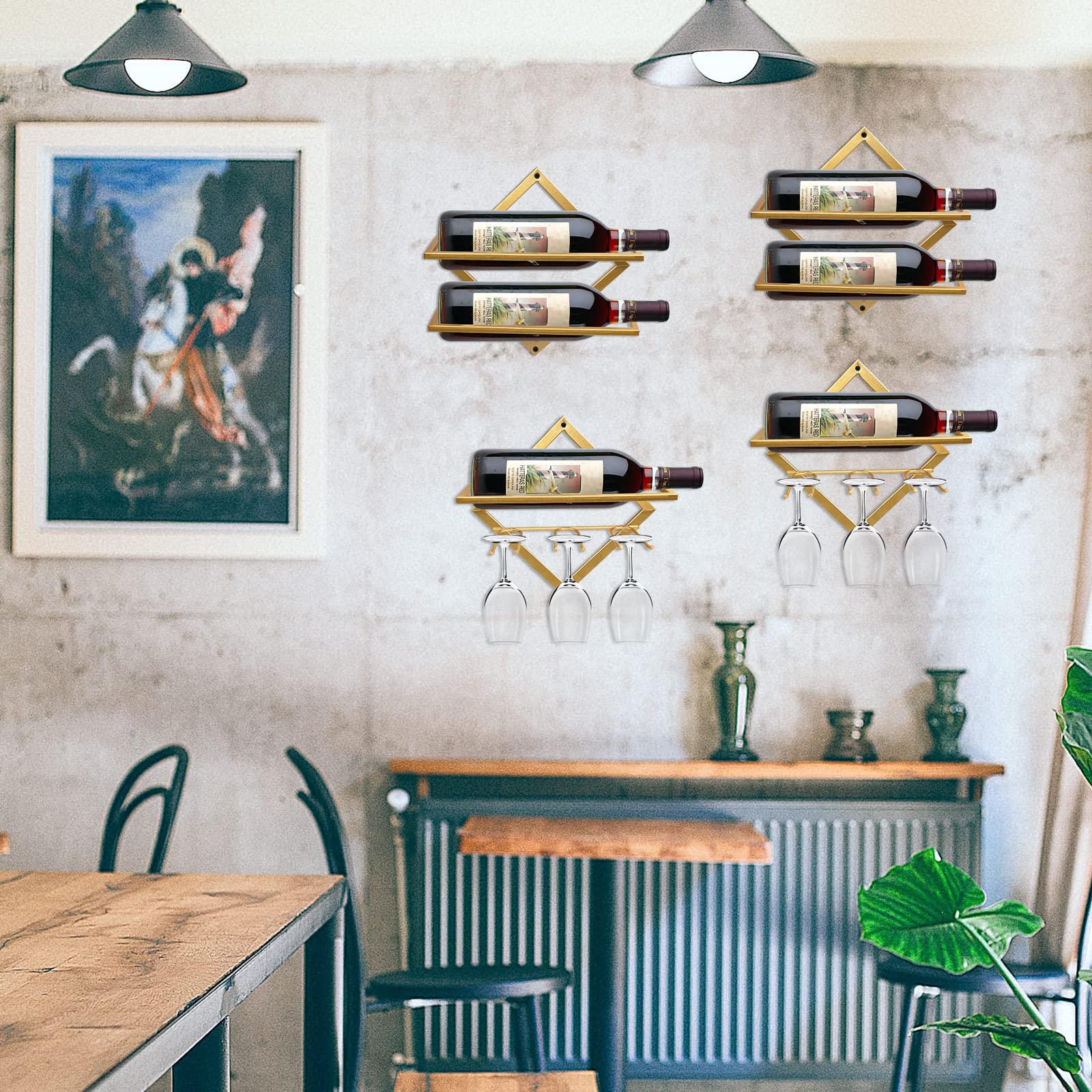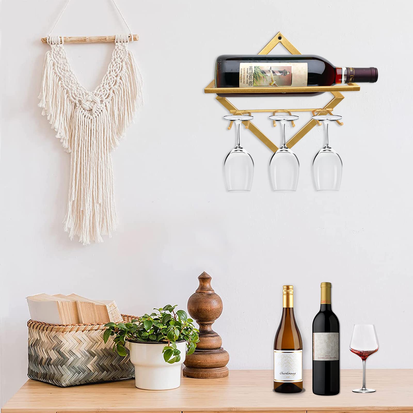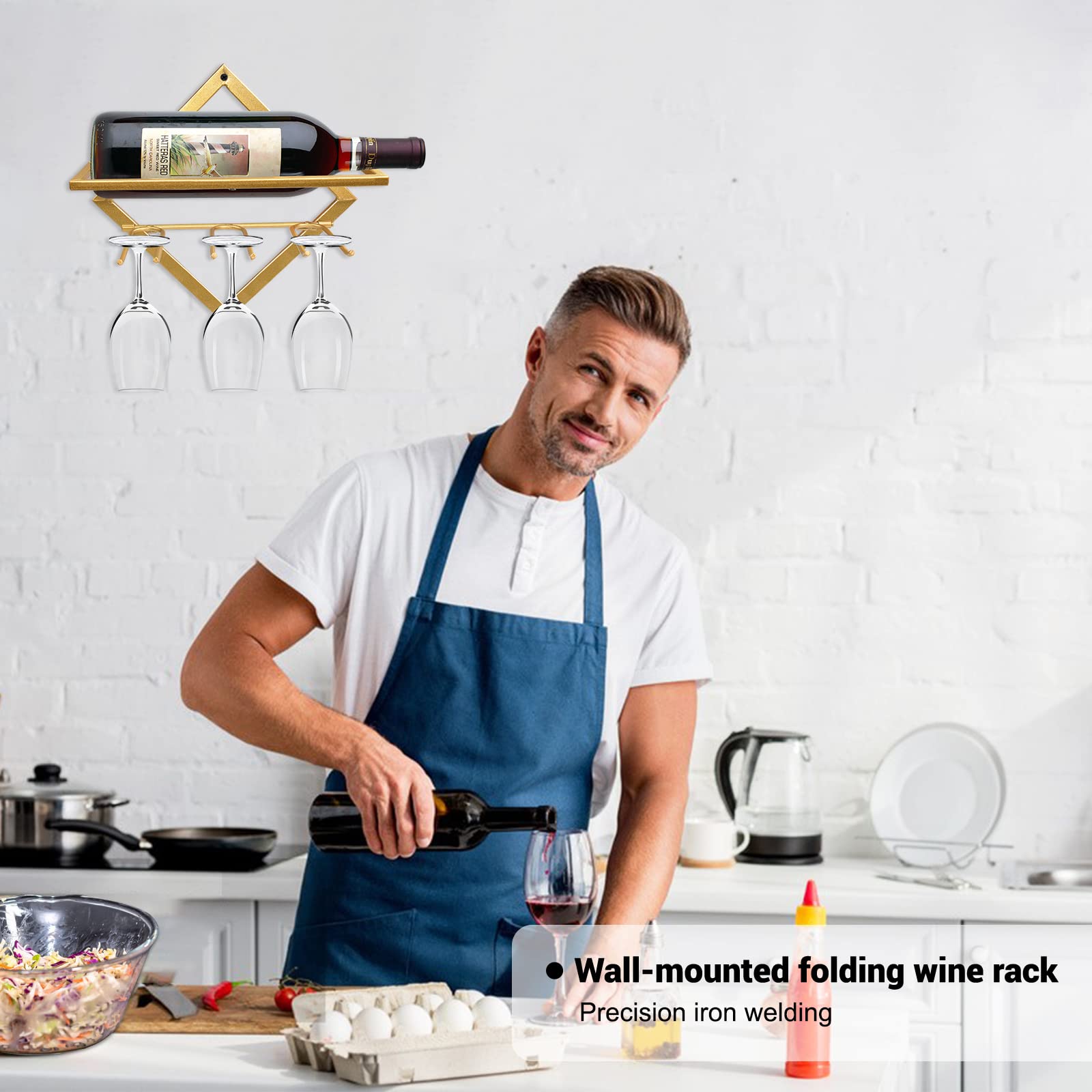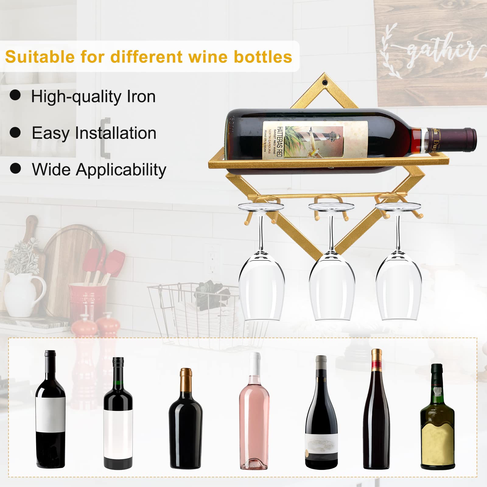 AUHOKY Metal Wall Mounted Wine Holder, Upgrade Collapsible Wall Hanging Red Wine Racks Organizer with 3 Stem Glass Holders, Red Wine Bottle Display Hanger with Screws for Home Kitchen Bar Wall Décor…