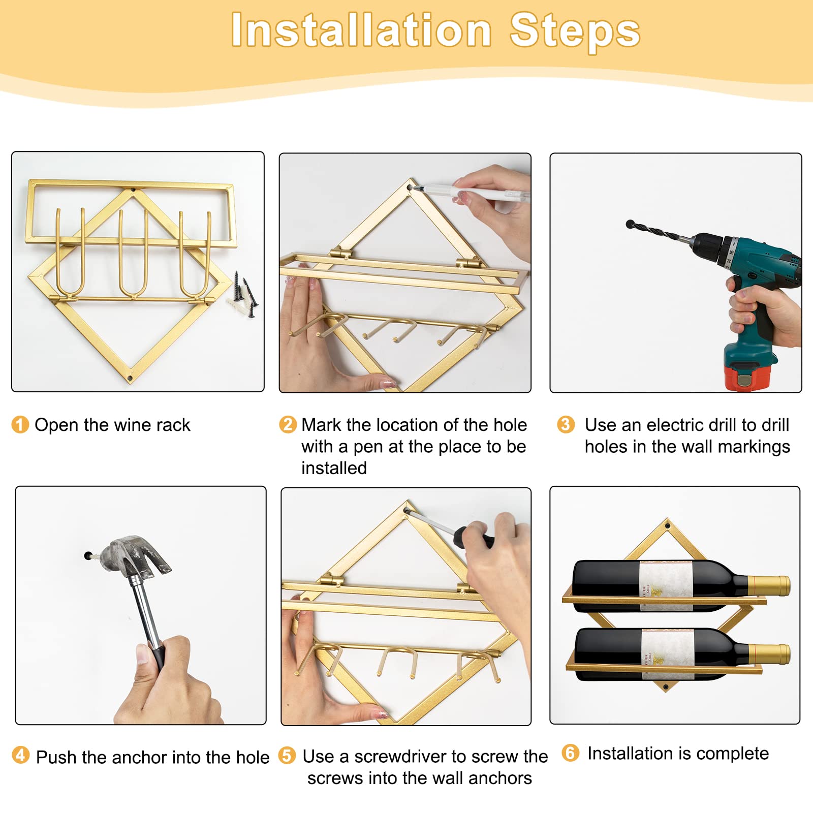 Details: Do you love to enjoy a glass of wine at the end of your crazy day or do you like to entertain at your home? AUHOKY wine rack is ideal for any wine lover. The wall mount wine or liquor bottle racks are a marvelous piece of furniture to complement the design of your home. Specification Material: Iron Color:Gold Size:Please see picture Package: 1 wine racks, 4 screws, 2 Plastic Expansion Nails Why choose our wall-mounted foldable wine rack? Perfect Design Our wine bottle storage rack is divided into two layers, which can store wine bottles and goblet at the same time, which is very suitable for home use. Space-saving Organization Designed with a wall-mounted style, this rack keeps wine and glassware organized without taking up floor space. Sturdy Metal Wine Rack Wine shelves is made of high quality sturdy iron metal, it is safe enough to hold the wine bottles. Upgraded Foldable Design Open-style frame design of the wine holder makes it easy to take out wine bottles. Easy to carry and store, and has a more design sense. Ideal Gift Choice Wall wine rack are an awesome way to display wine, making them perfect gifts to your family or friends. Elegant Modern Style You can hang this glass bottle storage set on your wall and display your liquor, wine or other bottles to add an elegant look to your walls. Easy to Assemble Rack comes with the necessary installation hardware for both on the wall or under the cabinet. This wall mounted space saver wine rack just need a small wall to put your wine, Solve the problem that have no place to put them, and and looks very tidy & nice,create more floor space for you.