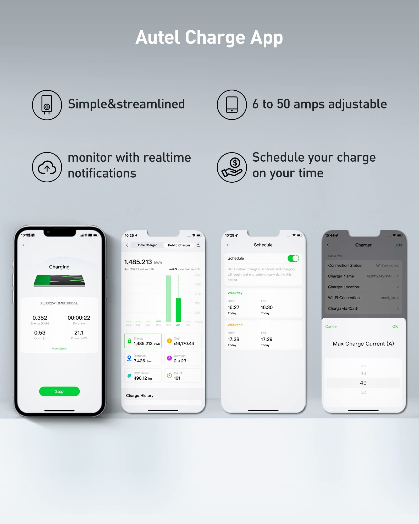 - 【Smart APP Control 】Use Autel Charge APP to control your charger and manage charge times, schedule charging while you're away, and optimize your charging to take advantage of off peak electricity. Bluetooth enabled, Wi-Fi connectivity, and Ethernet access make sure your automatic over the air (OTA) remote firmware updates keep you connected at the times you need.