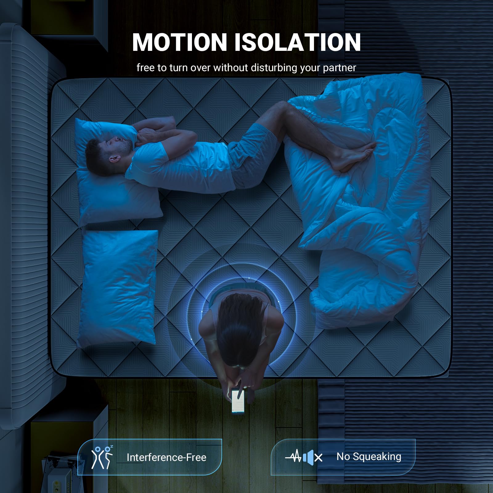 - MOTION ISOLATION WITHOUT DISTORTION: Each individually wrapped coil of the 10 inch full size mattress responds independently, reducing the transfer of motion between you and your bed partner. Non-woven pockets eliminate coil-to-coil friction, which prevents unwanted squeaks and noises.