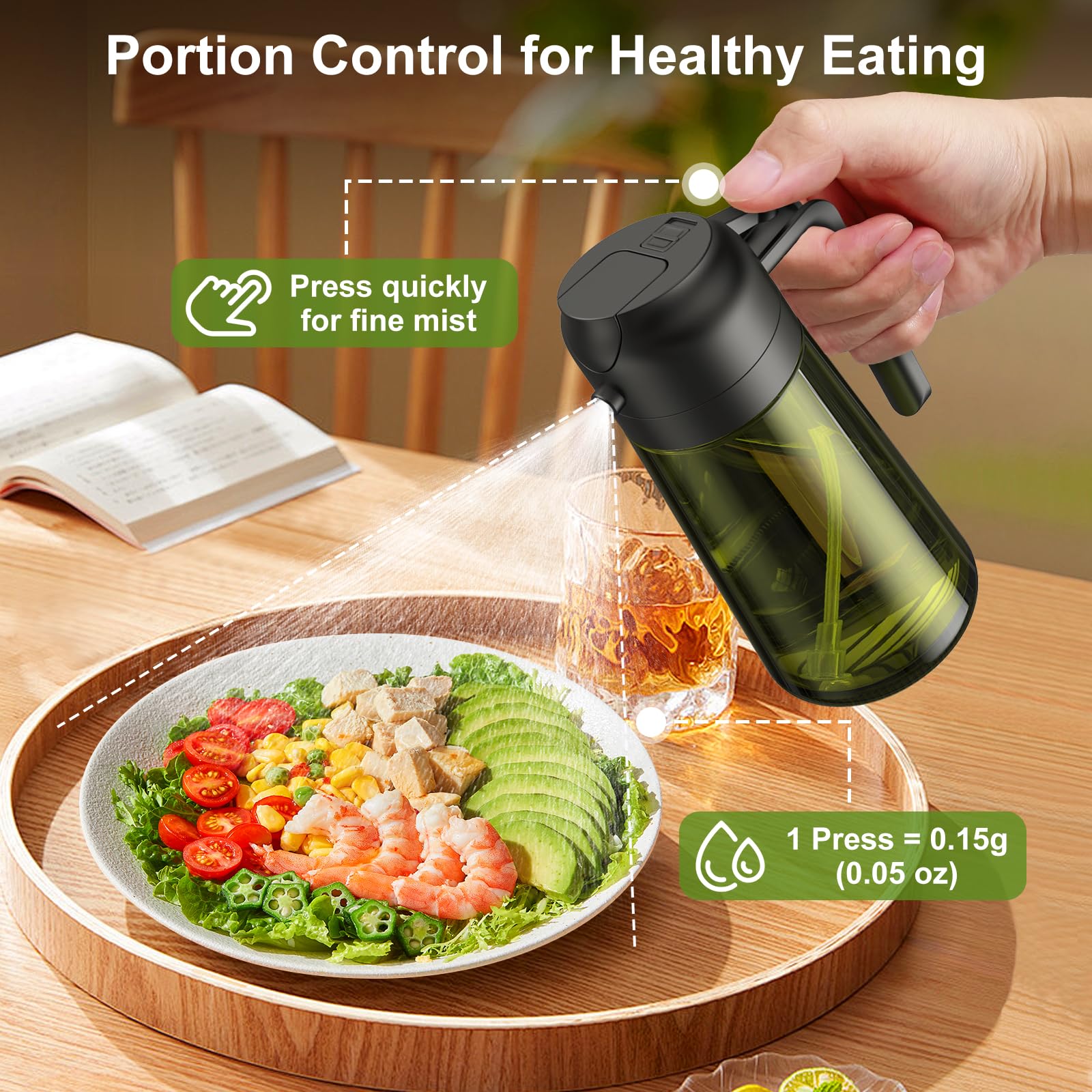- Spray & Pour:Our oil dispenser for kitchen features a dual-function design, which you can pour oil and spray oil—ideal for cooking, BBQ, steak, salads, and frying.