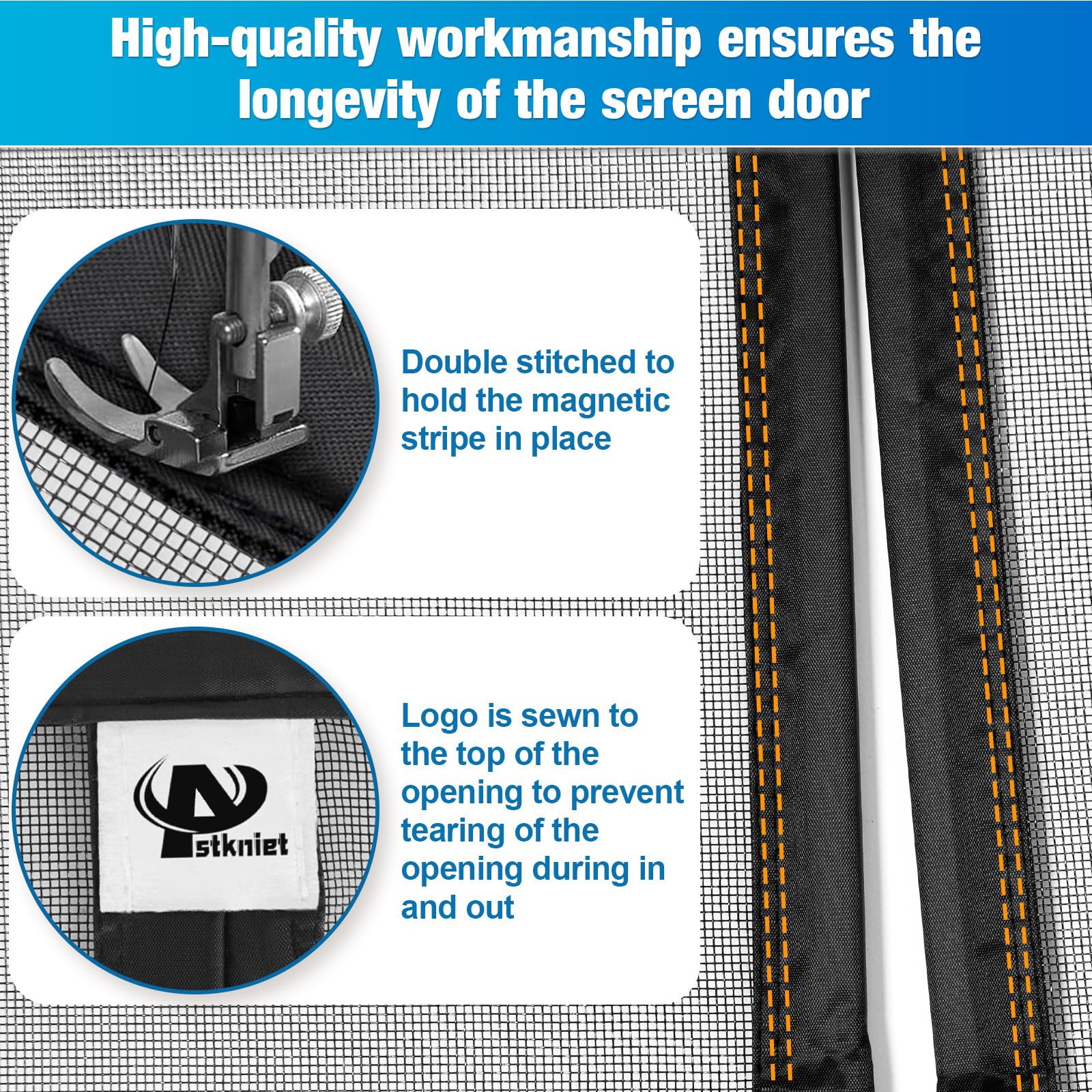 - 50% Higher Magnetic Force - Our door screen magnetic closure using the 7.8" longer magnets and reduced the space between two magnetic strip to reinforced the magnetic force. It makes the mesh door closes tightly and stays closed after walking through automatically. The strong magnets with the 6pcs gravity bars at the bottom will keep the screen door windproof and stable.