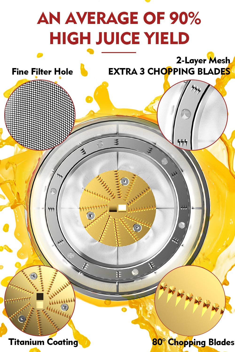 - 🍅PATENTED EXTRACTION SYSTEM FOR HIGHER JUICE YIELD - The titanium reinforced blade (163 Chopping Blades) and Germany-made 2-Layer micro mesh filter basket are made out of stainless steel and together are designed for optimum juice and nutrient extractio