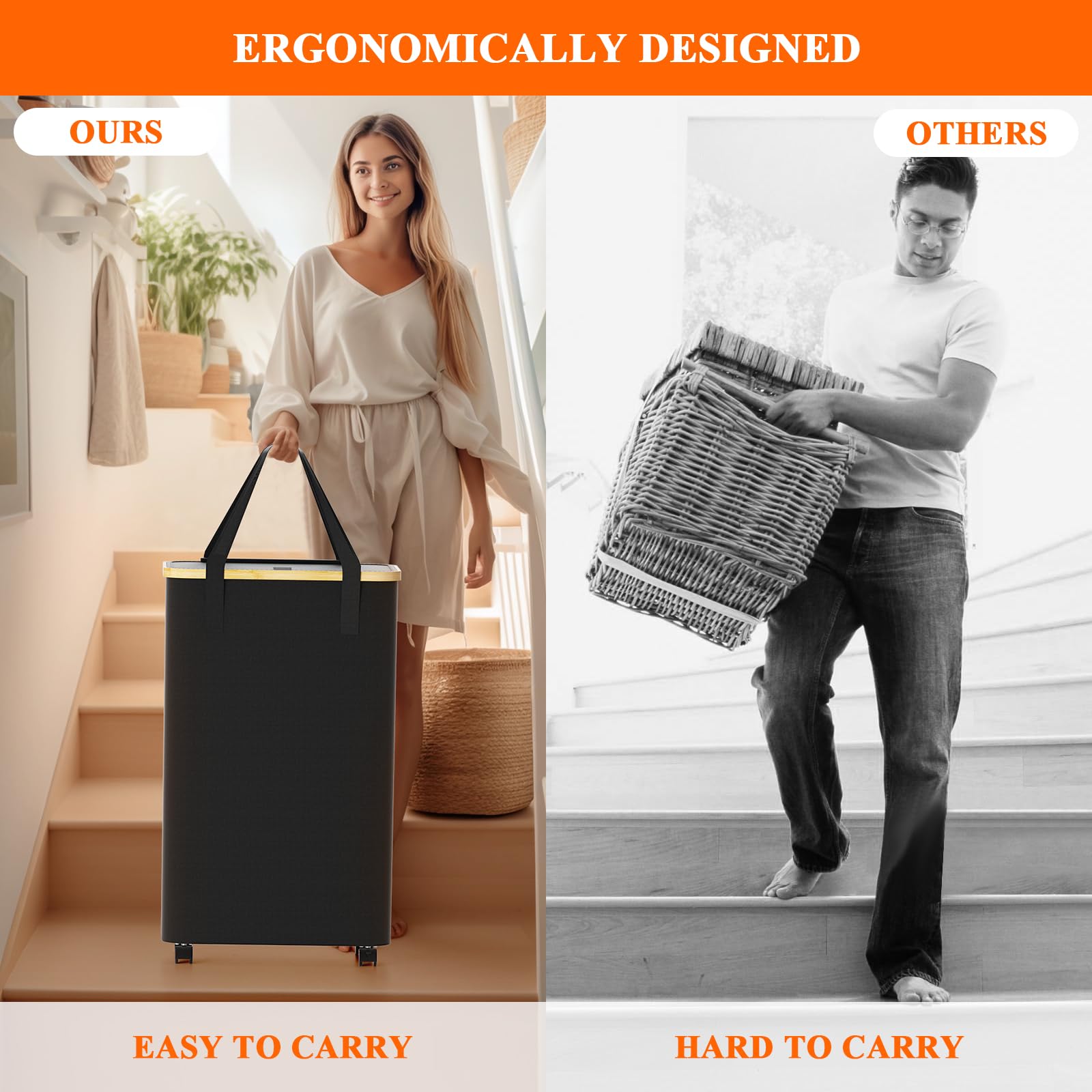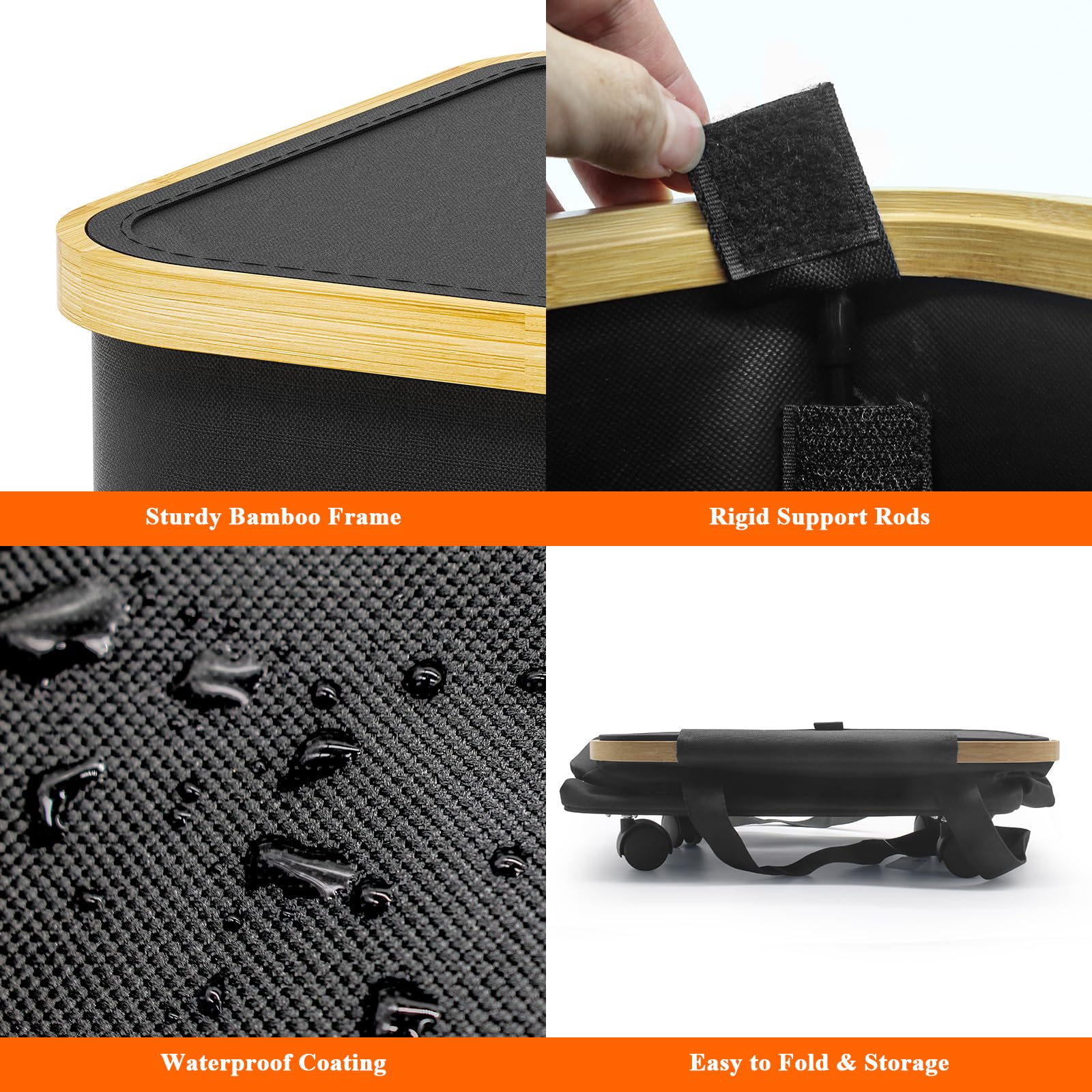 - 【 Freestanding Laundry Basket 】 The high-quality bamboo frame, carbon fiber support bar, and 600D polyester oxford fabric not only make our laundry hamper with wheels stand firmly but also make it a simple and elegant look that fits into any scene