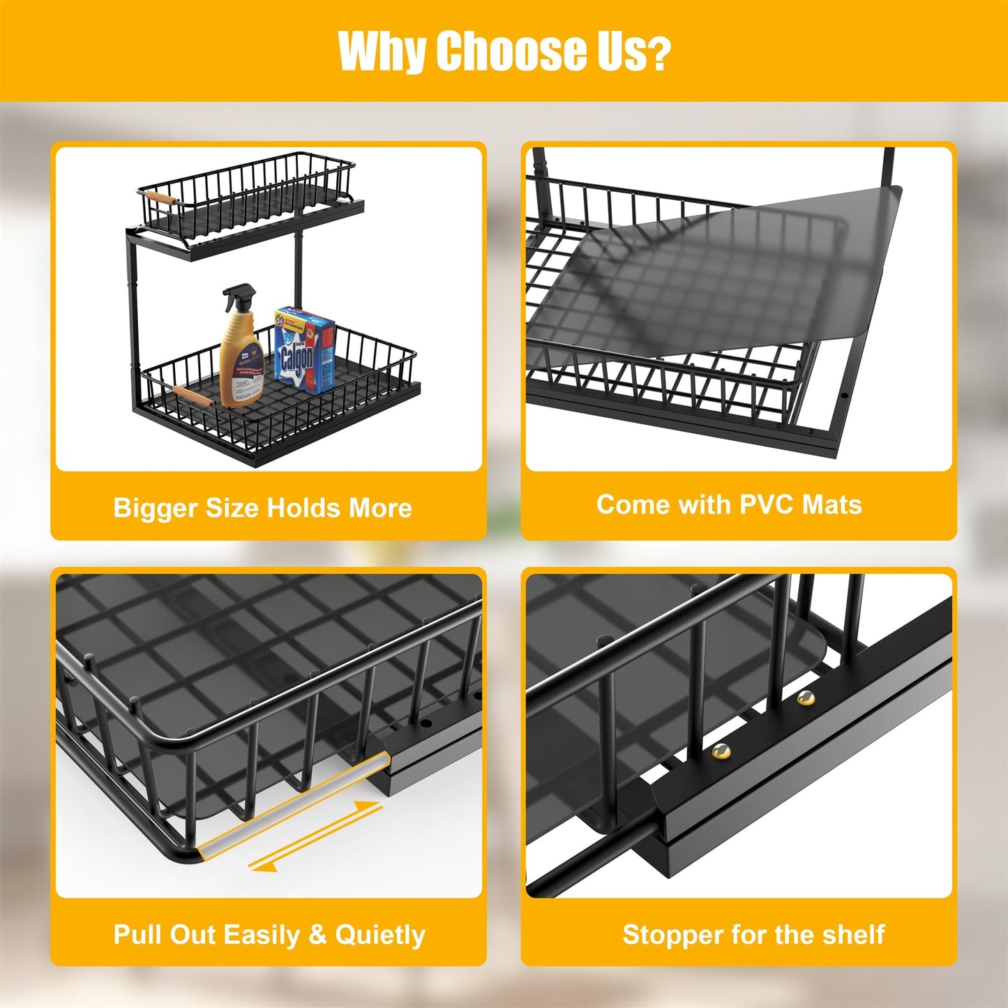 - DOUBLE SLIDING DRAWER: The two layers of the under sink organizer can be slided back and forth.By pulling, you can easily take and put any items on the cabinet organizers and storage. Not only that, both the top and bottom layers of the cabinet organizer come with PVC mat, which prevent your items from falling due to uneven surface.