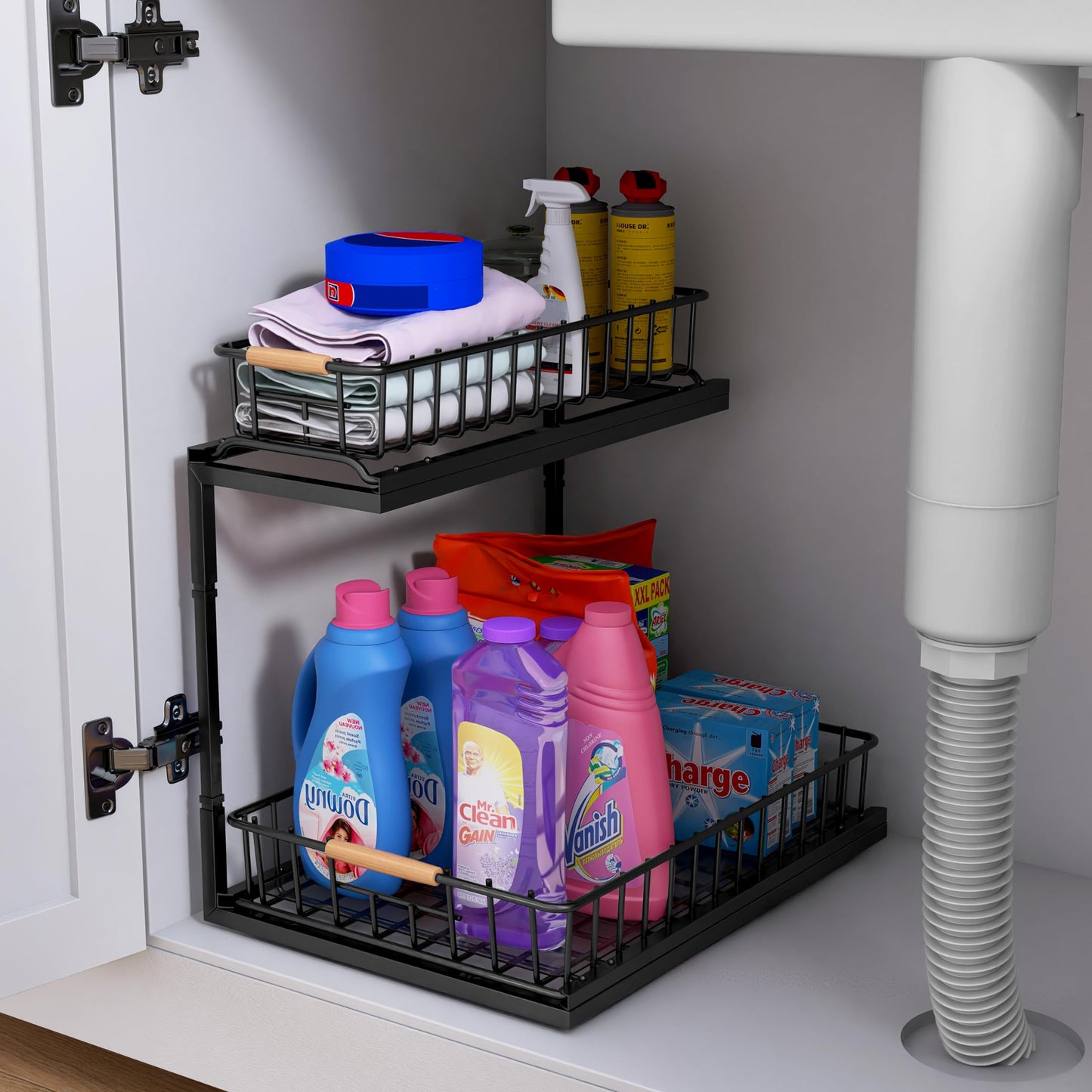 B-Land Under Sink Organizer and Storage, Metal Pull Out Kitchen Cabinet Organizer with Double Sliding Drawer, Multi-Purpose Cabinet Storage for Bathroom, Kitchen (1 Pack)