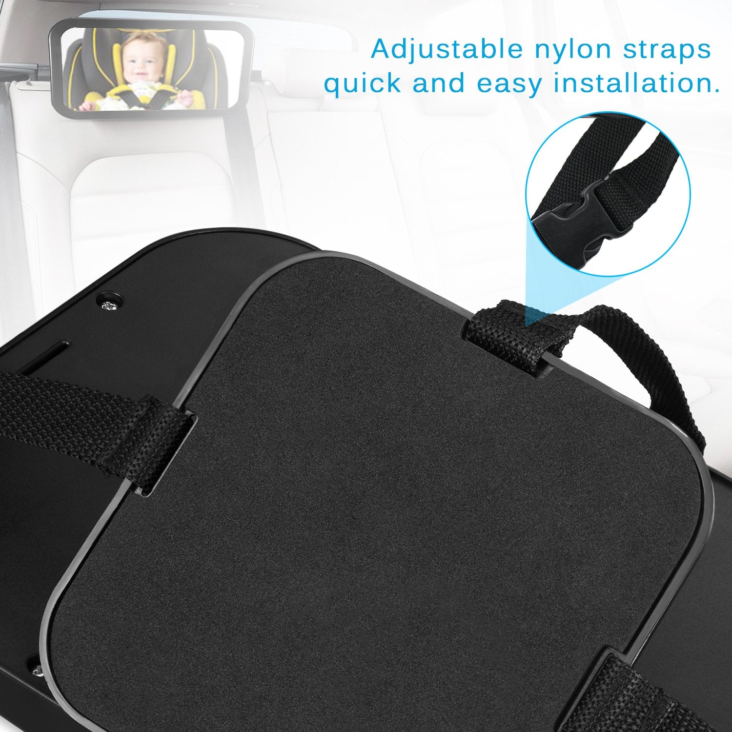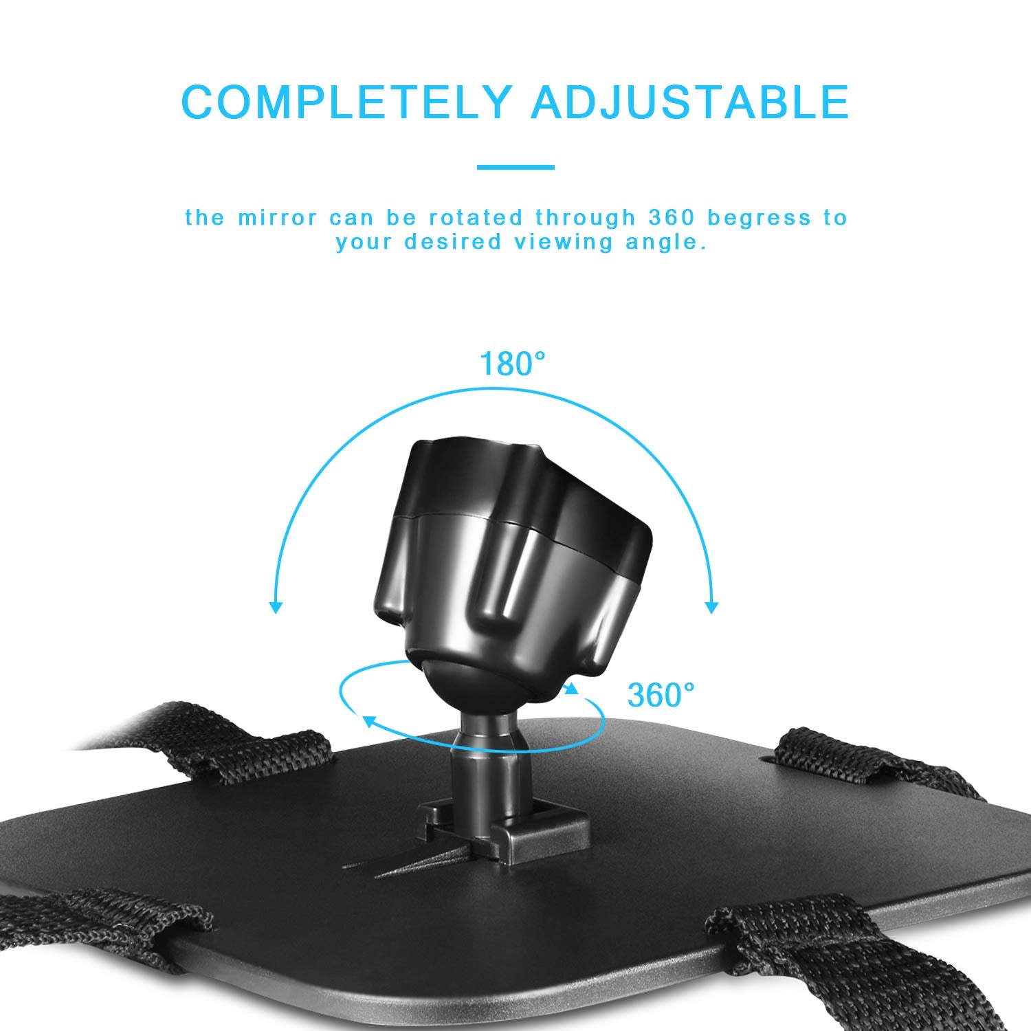 - Shatterproof Design and Steady Construction: This carefully designed baby mirror for cars is made of shatterproof glass and features an extra durable strapping system to ensure that the mirror will firmly stay in place even through bumpy roads.