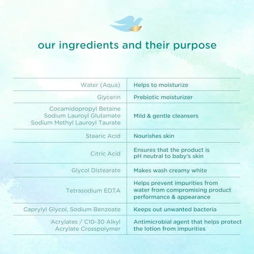 Details: Baby bath time is special. And with baby skin being 30 percent thinner than ours, the best care is the gentlest. To help protect your little one’s skin, we created Baby Dove Fragrance Free Moisture Hypoallergenic Baby Wash to provide ultra-gentle care for baby's sensitive skin. Unlike other baby washes, our tear-free and hypoallergenic baby wash and shampoo is made with 100 percent skin-natural nutrients, which are identical to those naturally found in skin, and prebiotic moisture to help replenish the essential moisture and nutrients that baby’s skin can lose during bath time. This fragrance free baby bath wash is safety-tested and pediatrician recommended. And our caring formula is gentle enough to use on newborns and free of dyes, parabens, sulfates, and phthalates. To use this baby wash, gently wet baby’s hair and skin with warm water, work into a lather, and rinse for touchably soft skin. We know there’s no right or wrong way to be a parent – only your way. That’s why Baby Dove is here to help give you confidence that you’re providing the best skin care for your baby's skin. Our Fragrance Free Moisture Hypoallergenic Baby Wash is sold in 13 oz. and 20 oz. bottles. Looking for something for a calming bedtime routine? Look for our Baby Dove Calming Moisture Baby Wash and Shampoo.