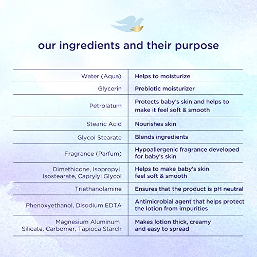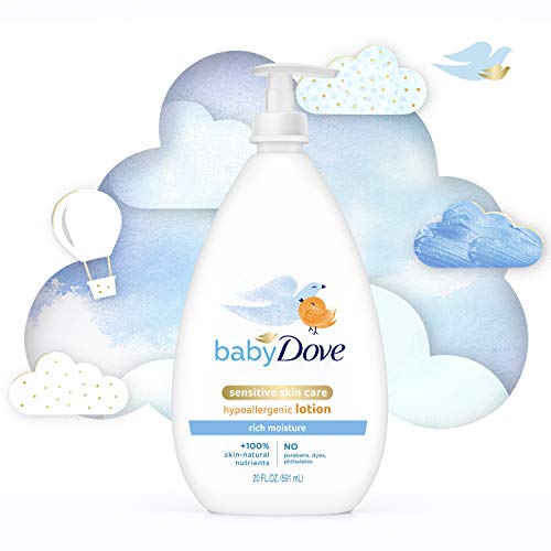 - Rich moisture: Baby Dove Rich Moisture Hypoallergenic Body Lotion (20 oz.) gently nourishes and hydrates baby's sensitive skin after bath time, leaving it moisturized for 24 hours