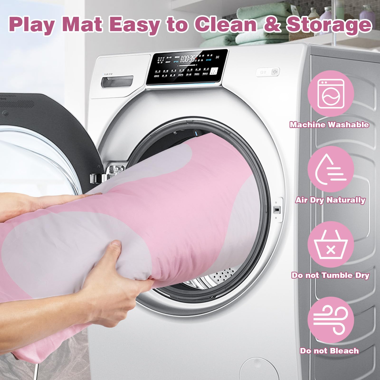 - Machine Washable Non-Slip Design:The play mats for babies and toddlers is made of soft and breathable polyester fabric, and the backing of the play gym is a non-woven fabric which is anti-slip, so the infant tummy time mat won't slide around and safe to use. The padded is machine washable and wipeable for easy clean
