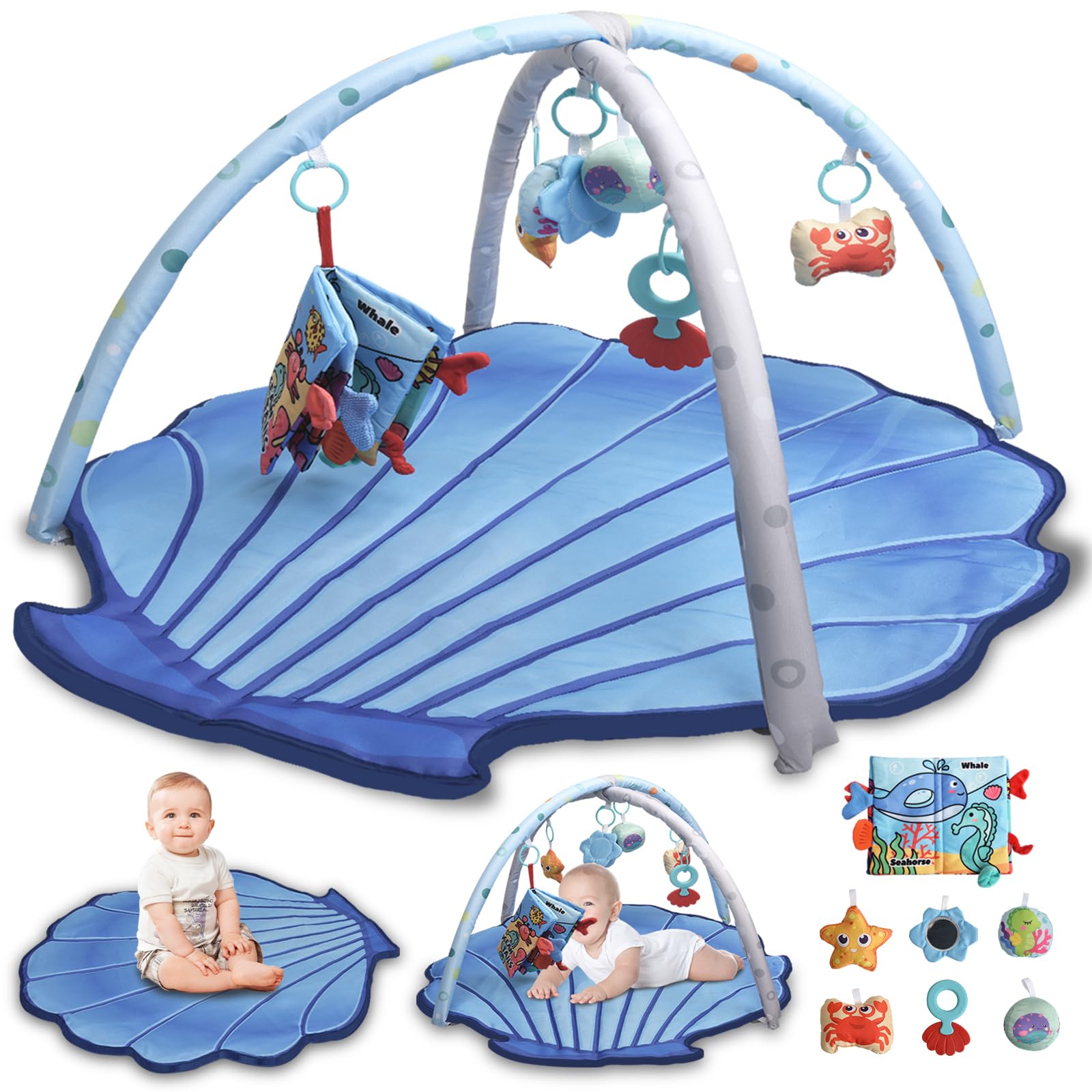 - 【Baby Activity Gym Play Mat】Our ocean-themed Baby Play Gym comes with some adorable toys that will easily stimulate your baby's curiosity in all directions while lying or sitting. Includes 6 detachable hanging toys (4 ocean animal sensory toys, 1 baby mirror and 1 fishtail rattle), 1 ocean cloth book and a soft, large-sized shell play mat. Fully meets baby's developmental needs.