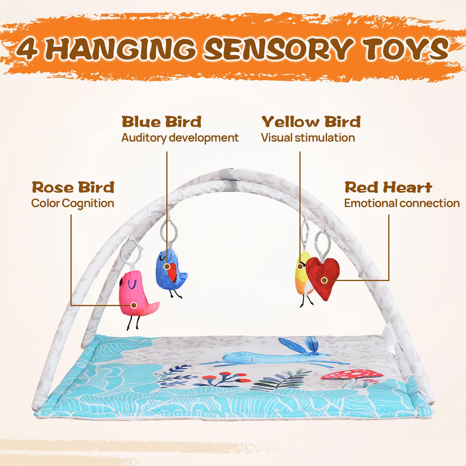 - [Enhancing Sensory Development]: Our baby activity center is a haven of joy. With 4 engaging toys, it activates your baby's senses and fosters curiosity. Under adult watch, allow your baby to play unrestricted on this infant playmat.