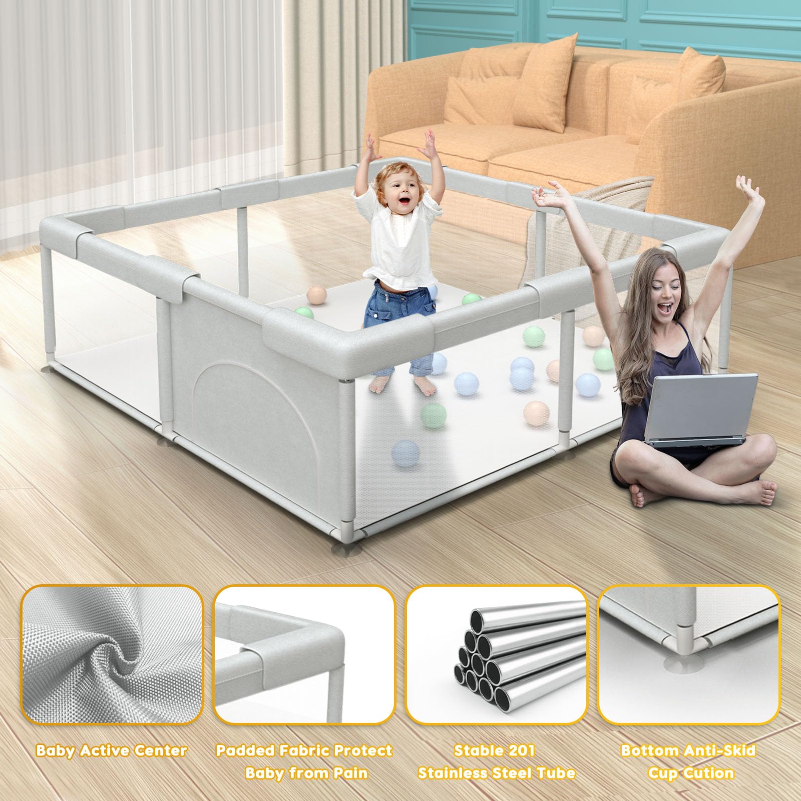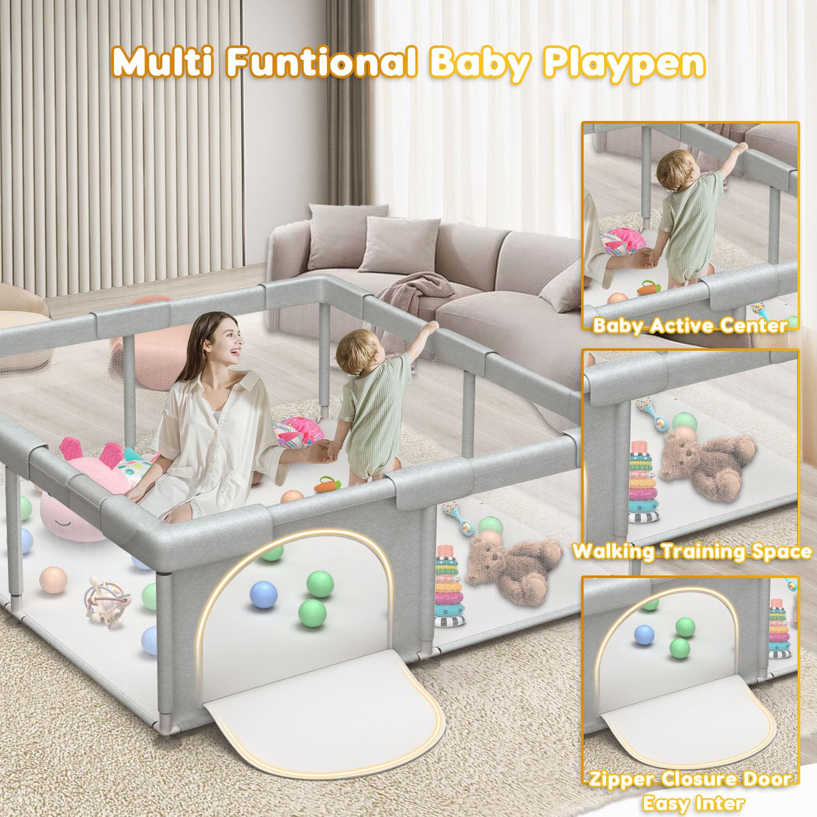 - 👍【360° All-Vision Design】The 360° all-vision design of this baby playpen allows parents to keep an eye on their little ones from all angles. Whether you're in the kitchen or the living room, you can always monitor your baby's activities with ease. Outter zipper design prevents the baby running out from the baby play pen active center accidentally.