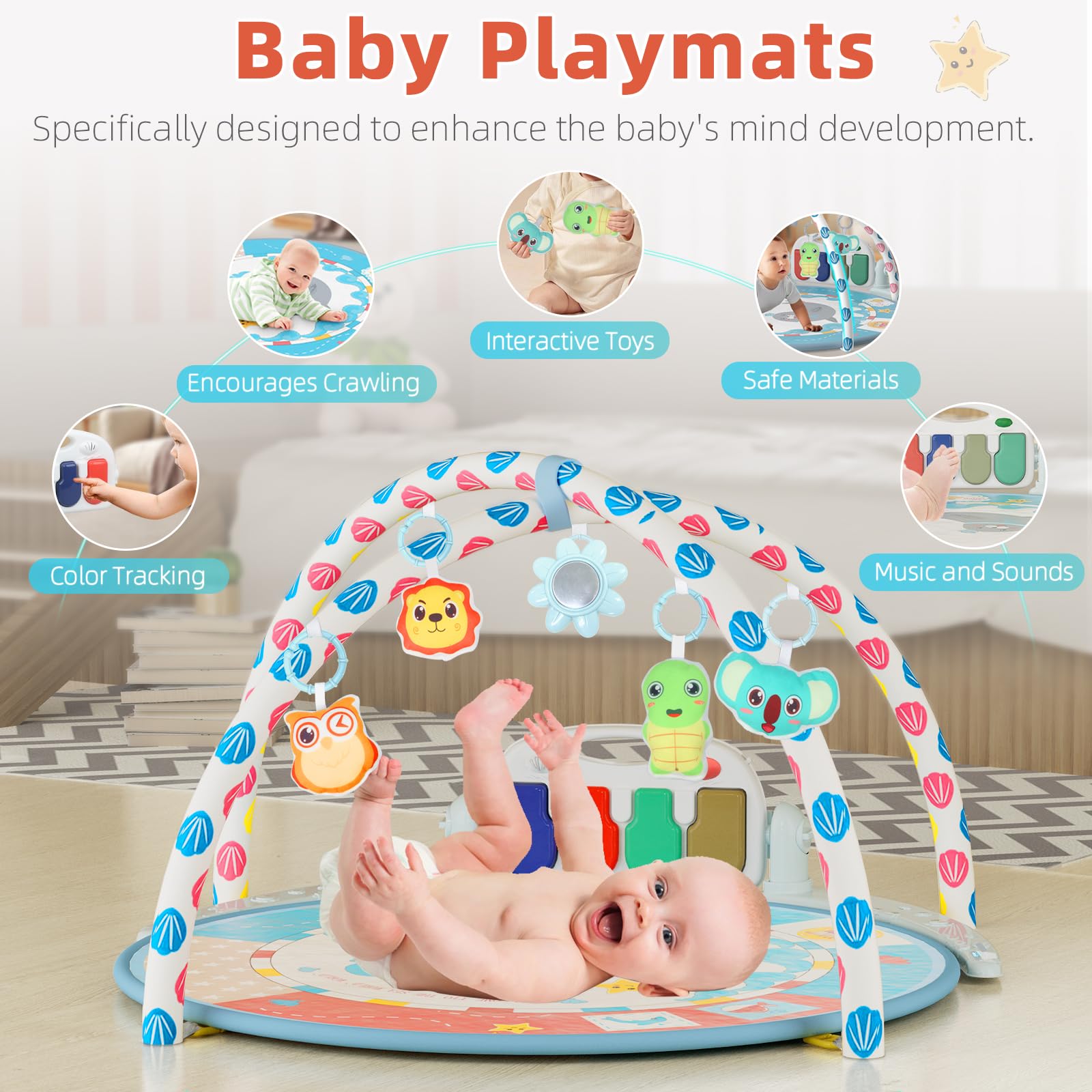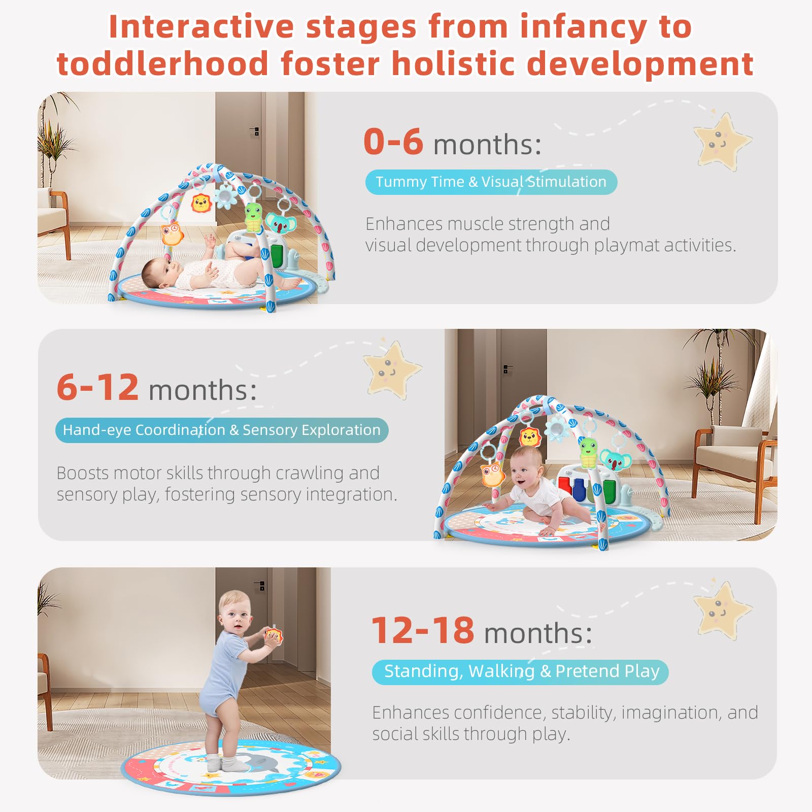 - Musical Enlightenment: Our baby tummy time mat is equipped with piano keys that play 40 soothing melodies, our play mat fosters a baby's interest in music and rhythm while promoting auditory development. The varied tones and rhythms also help regulate emotions and provide comfort.