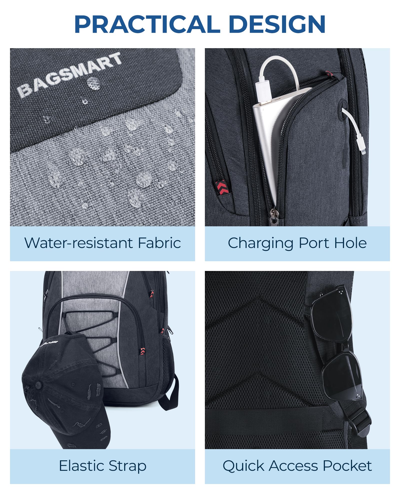 - Practical Details For Convenience: External bungee-compression system offers options for storage and organization, making it easy to stash a jacket, pair of shoes or ball. Additionally, this laptop backpack for men and women comes with a separate pocket for a portable charger and a USB charging hole, making it easy to charge your electronic devices and ensure you're always connected and powered up when you're traveling.