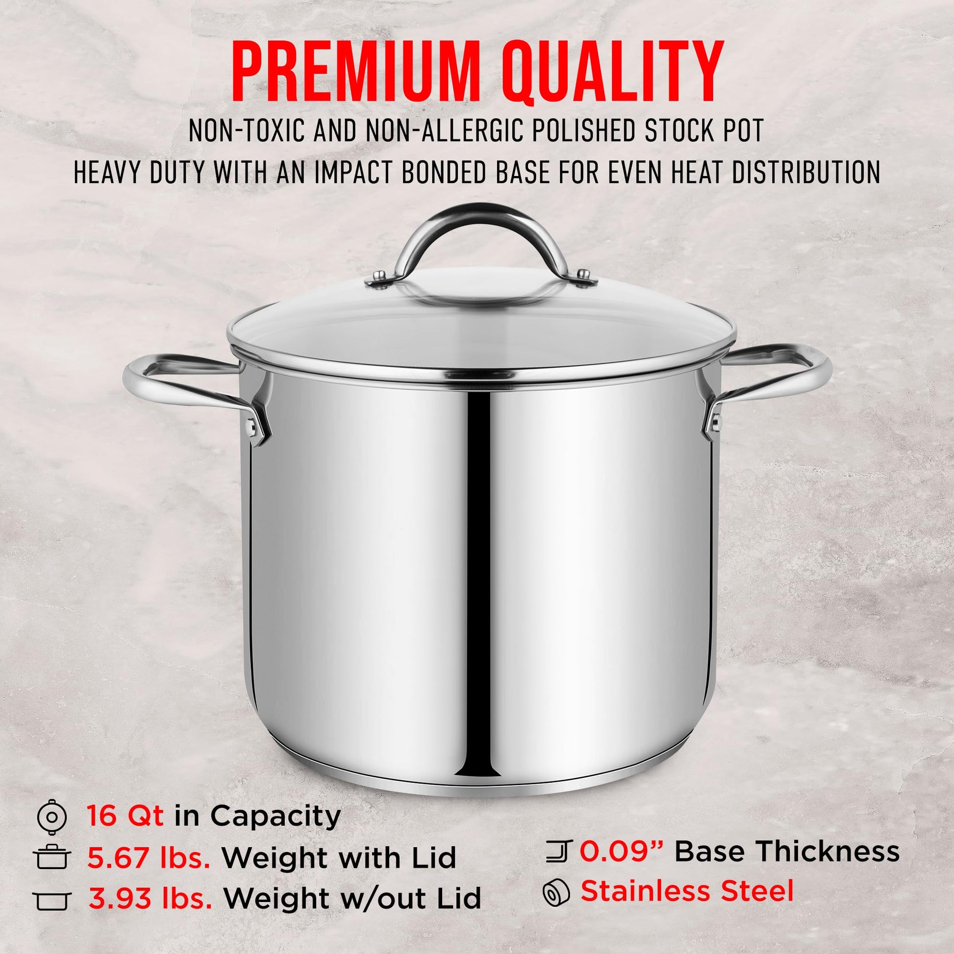 - HEAT DISTRIBUTION: Our stainless stock pot is carefully crafted with an impact-bonded base, so you can cook your meals perfectly with the optimal degree of effective heat distribution. Whether you’re simmering, boiling, or stewing, you can trust that this stock pot is the perfect tool for you.