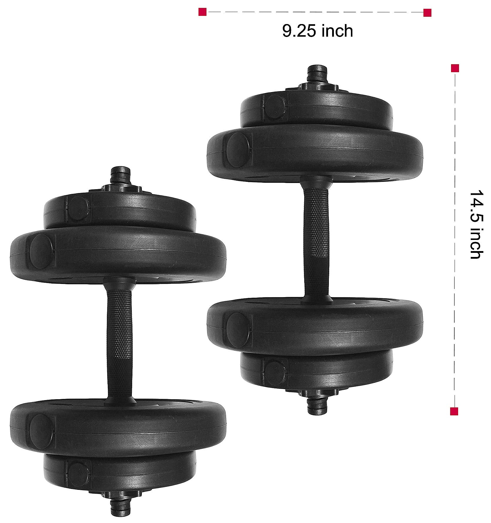 - Adjustable Weight: Weights come in 4 2.5-pound cement plates and 4 7.5 pound cement plates with 2 14-inch dumbbell handles and 4 collar locks