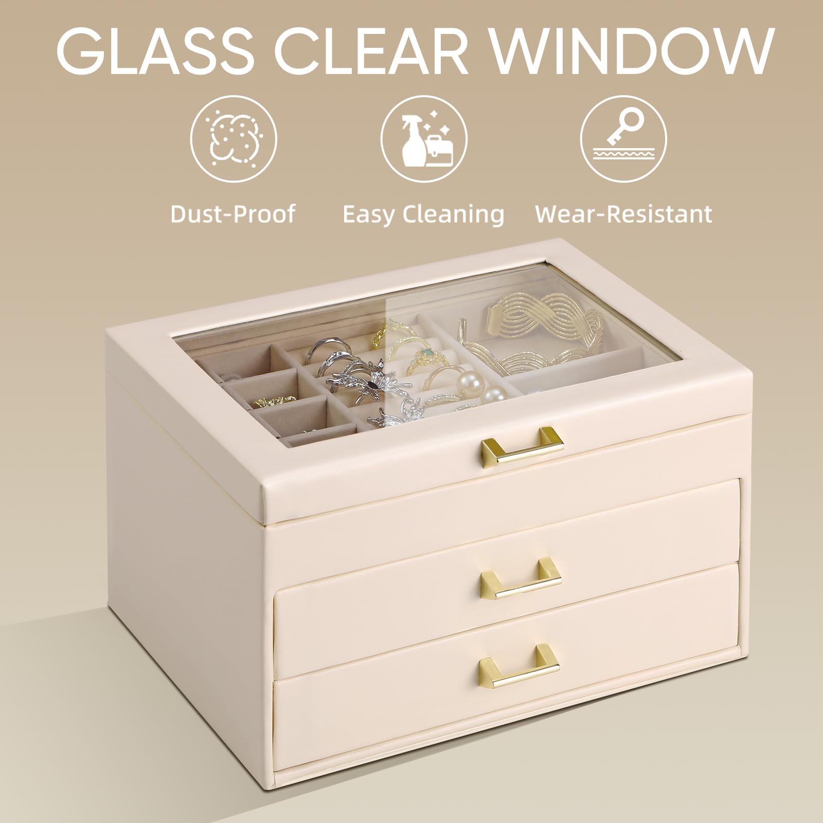 - [TRANSPARENT TOP GLASS WINDOW] The jewelry boxes for women feature a transparent glass lid design, creating a sleek and modern look. The clear transparent window allows you to easily see and find your favorite pieces of jewelry at a glance.