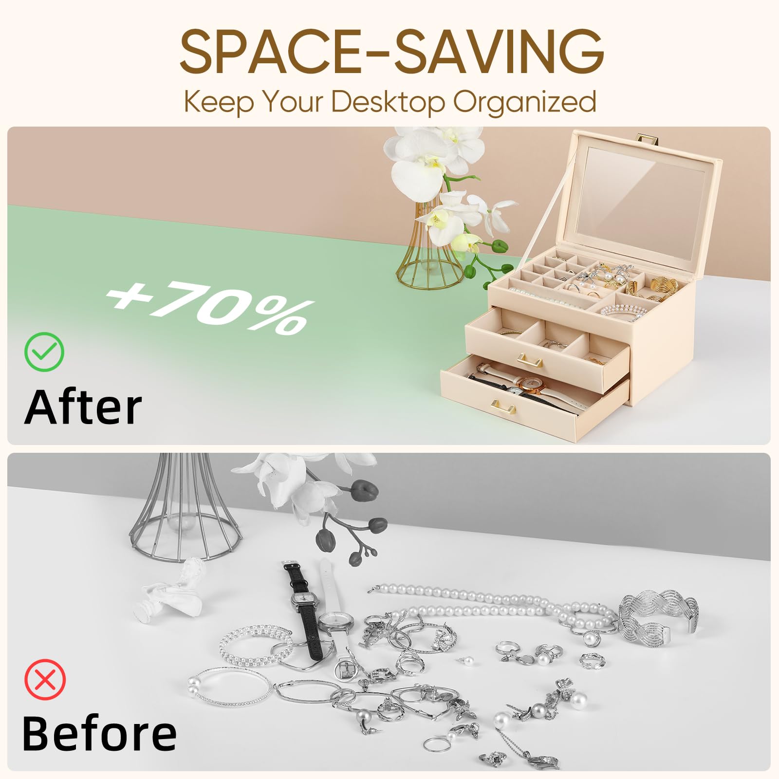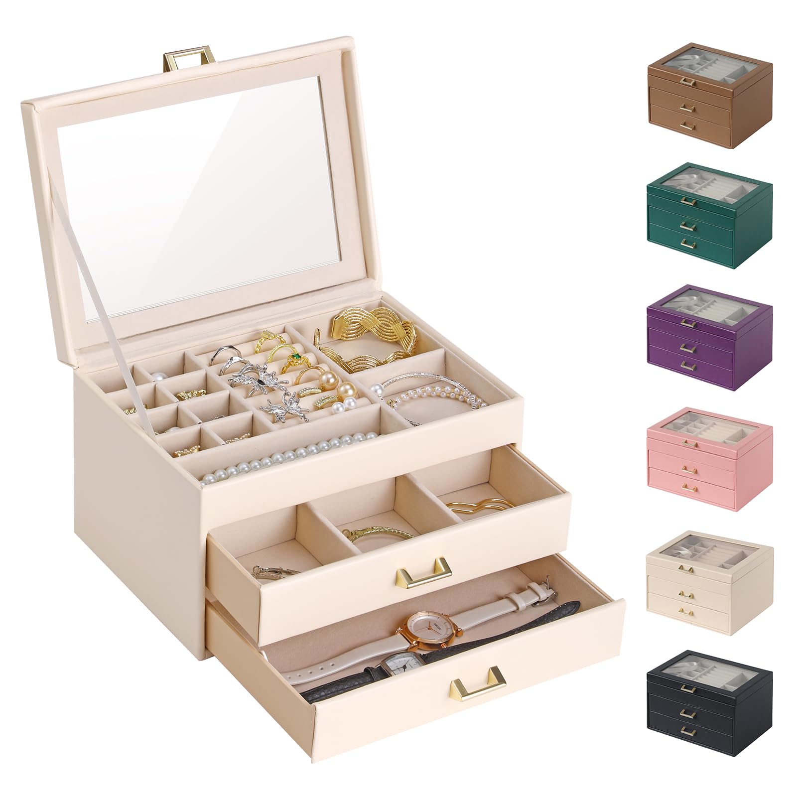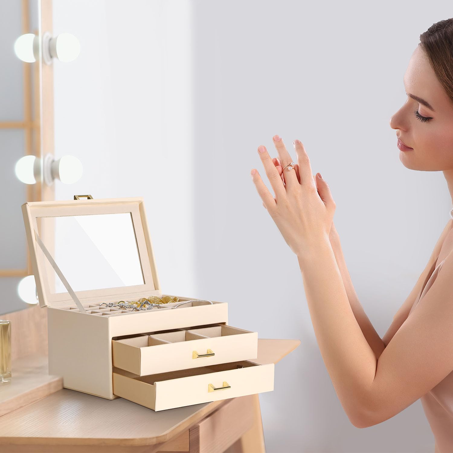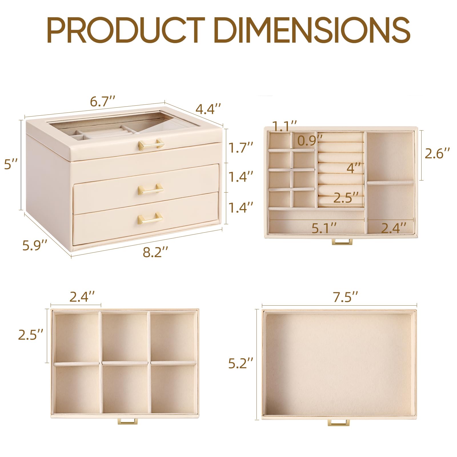 - [LARGE CAPACITY] With its 3-layer design, the jewelry box organizer allows you to organize your small jewelry like rings and earrings on the top layer, while the bottom two drawers are perfect for larger pieces such as bracelets and necklaces. Measuring 8.3''x6''x5'', this jewelry organizer provides an ample space for your entire jewelry collection.