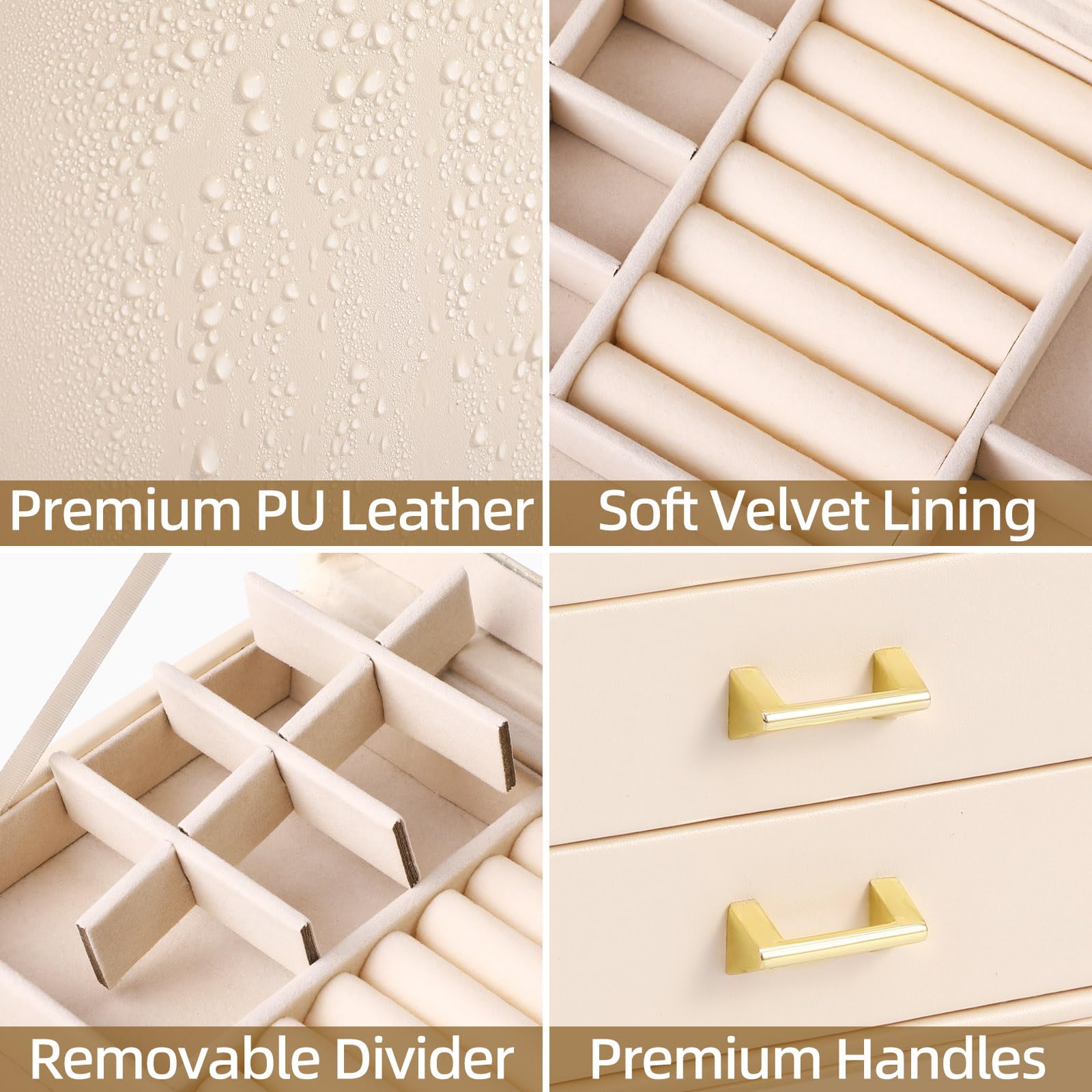 - [PREMIUM MATERIALS] BALEINE Jewelry box is made with high-quality PU leather on the exterior (Including the bottom), providing a waterproof surface. The interior is lined with luxurious velvet, offering a soft and scratch-free environment for your jewelry. The gleaming metal handle, high quality PU leather and all internal materials ensure durability, water resistance, deformation resistance, and easy cleaning.