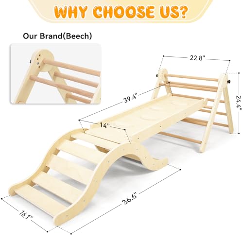 - 【SOLID WOOD CLIMBING FRAME】This pikler triangle climber is made of high-quality wooden, and the modern design makes it very beautiful. It can be adjusted to multiple angles so that it will come in various sizes.