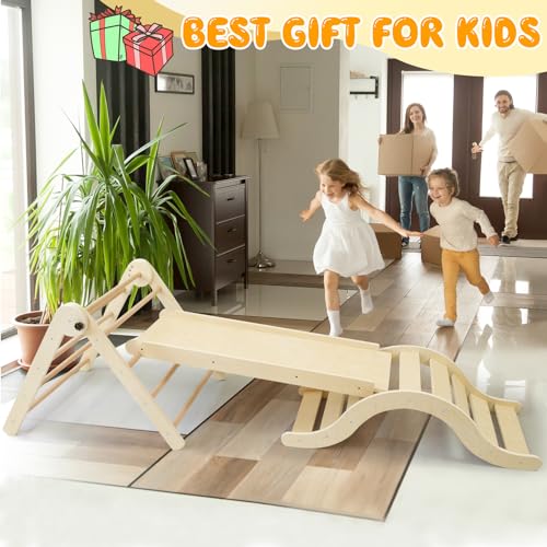 bbgroundgrm Pikler Triangle Set Climber 5 in 1, Toddler Climbing Toys Indoor Folding with Ramp & Arch & Mat for Montessori Play Gym for Toddlers and Kids (Natural)(99" Wx21 Dx23 H)
