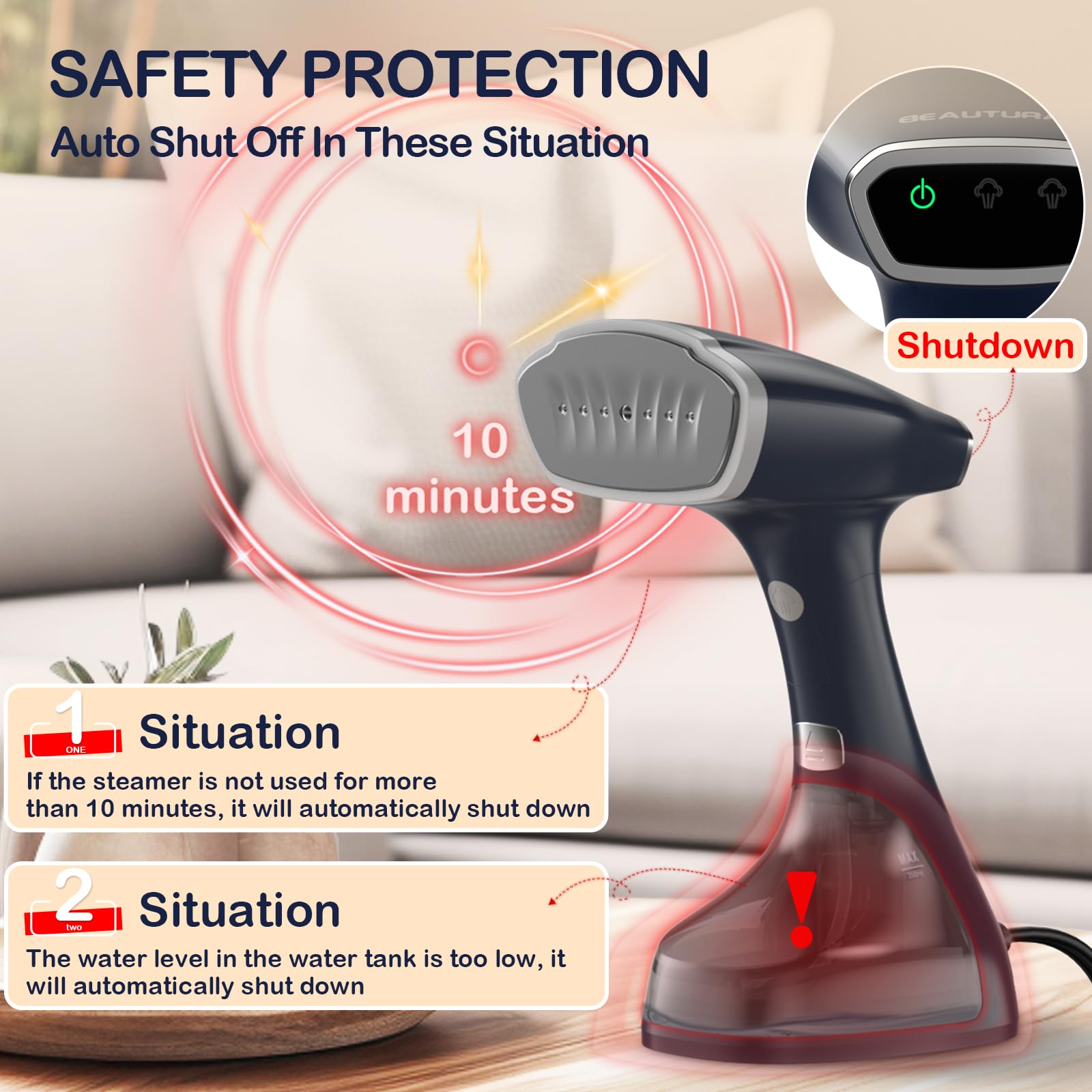 - Intelligent safety meets daily household: Watch the auto-shutoff magic: when low water in water tank, it gracefully powers down like a considerate butler. If you forget to turn off the steamer within 10 minutes, it will also kindly turn off the clothes steamer prevent damaged by overheating.