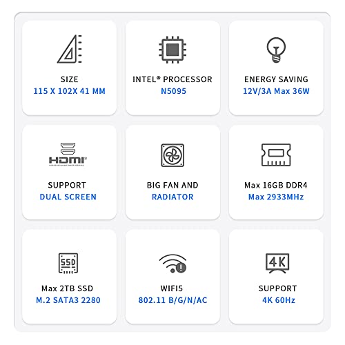 - ⚡【Smooth & Light weight】Beelink MINI S Mini PC comes with Intel 11th Gen 4-Cores N5095(up to 2.9GHz), preinstalled with W11 Pro, and supports Linux operating system. This mini-pc is suitable for Zoom meetings/Skype, allows to run Office, PS, surf the internet and watch stream video at the same time. The Mini Computer measures only 115 x 102 x 41mm, which is ideal for diverse usage scenarios such as office, online education, entertainment, industry, etc.