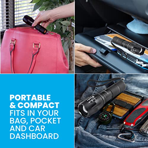 - Adjustable Zoom: Zoom in to create an ultra-strong beam of light or zoom out to widen the area of light with the twist of your fingers. Simply twist the head of the flashlight to adjust the zoom to your needs