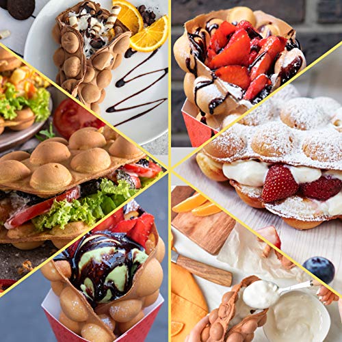 Details: Unlock a world of culinary delights and make every meal an adventure with our Bubble Shaped Hong Kong Style Waffle Maker, the ultimate tool to bring the taste of authentic fluffy pancakes and crispy waffles into your home! Indulge in a world of delicious possibilities as you create mouthwatering treats. Top your sweets with luscious chocolate, gooey caramel, or colorful sprinkles for a heavenly breakfast or dessert. Let your imagination run wild – use it to make ice cream cones, pizzelle, pizza waffles, grilled cheese sandwiches, or even hash browns. The included cone rack adds a touch of convenience to your creations. Our cute waffle maker is designed with your convenience in mind, featuring a locking handle and a compact design that allows for easy vertical storage, saving valuable space in your kitchen. Why wait? Get ready for a delightful culinary adventure filled with fun and creativity. Elevate your cooking experience, entertain guests, and create unforgettable moments filled with delicious flavors and endless fun!