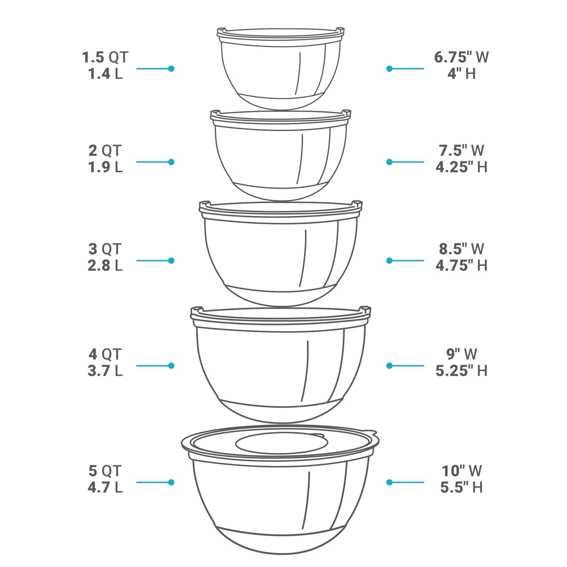 Nested Storage: Designed to stack seamlessly, this set of 5 bowls (1, 1.5, 3, 4, & 5 qt) optimizes your kitchen space.