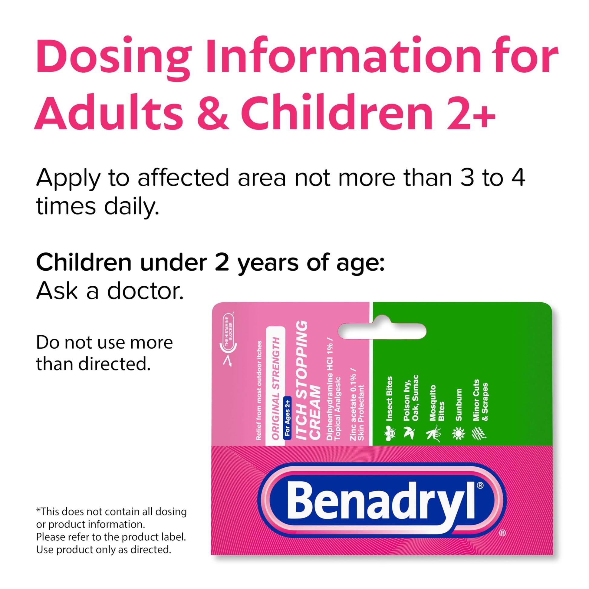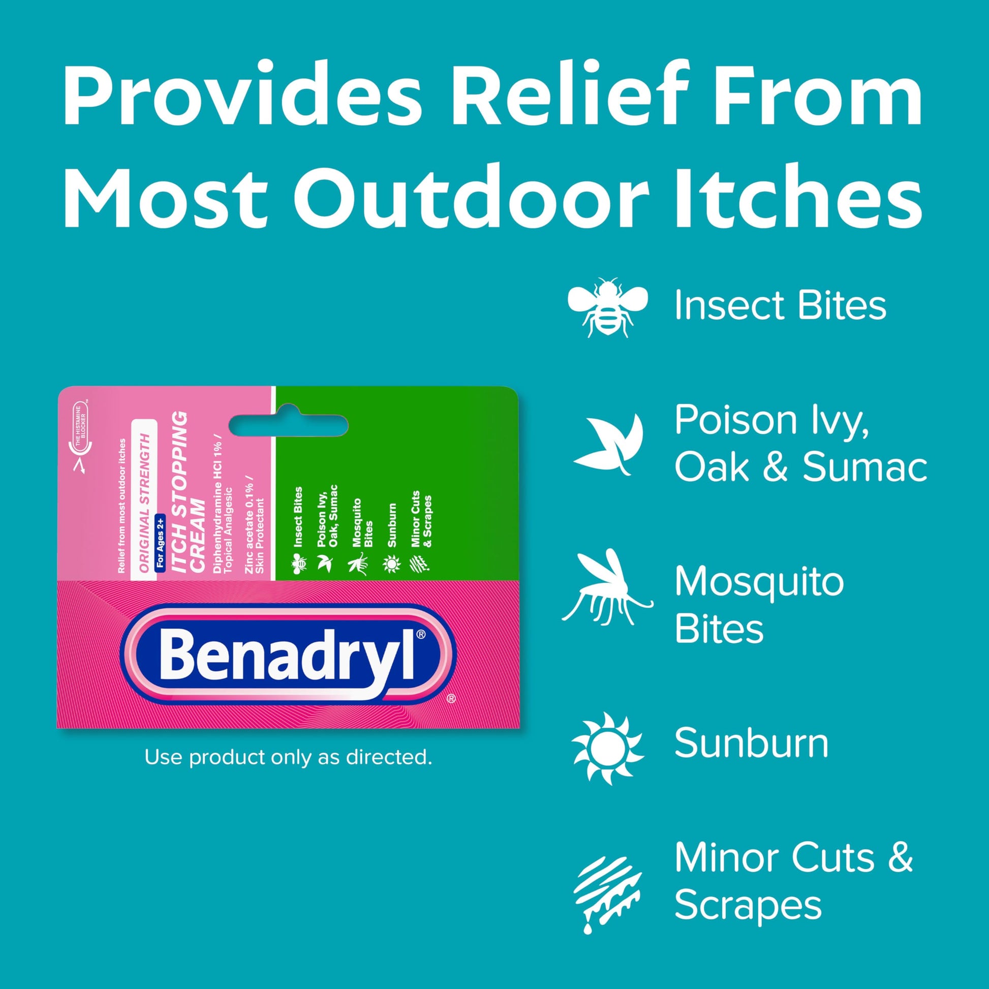 Details: Benadryl Original-Strength Itch Stopping Anti-Itch Cream provides relief from minor pain and skin itching caused by most outdoor itches. Made with 1% diphenhydramine hydrochloride, a topical analgesic pain reliever, and 0.1% zinc acetate skin protectant, this topical cream temporarily relieves itching associated with insect bites, minor burns, sunburn, minor skin irritations, minor cuts, scrapes and rashes due to poison ivy, poison oak and poison sumac. The soothing itch cream dries the oozing and weeping of poison ivy, poison oak, and poison sumac. Original Strength Benadryl Itch Stopping Cream is intended for ages two and up and is great to keep on hand during outdoor activities such as camping, hiking or taking a walk with the family.