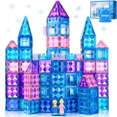 BENOKER 102pcs Frozen Castle Magnetic Tiles - 3D Diamond Building Blocks, STEM Educational Kids Toys for Pretend Play, 3 4 5 6 7 8 Year Old Girl Birthday Gifts for Your Princess and Prince