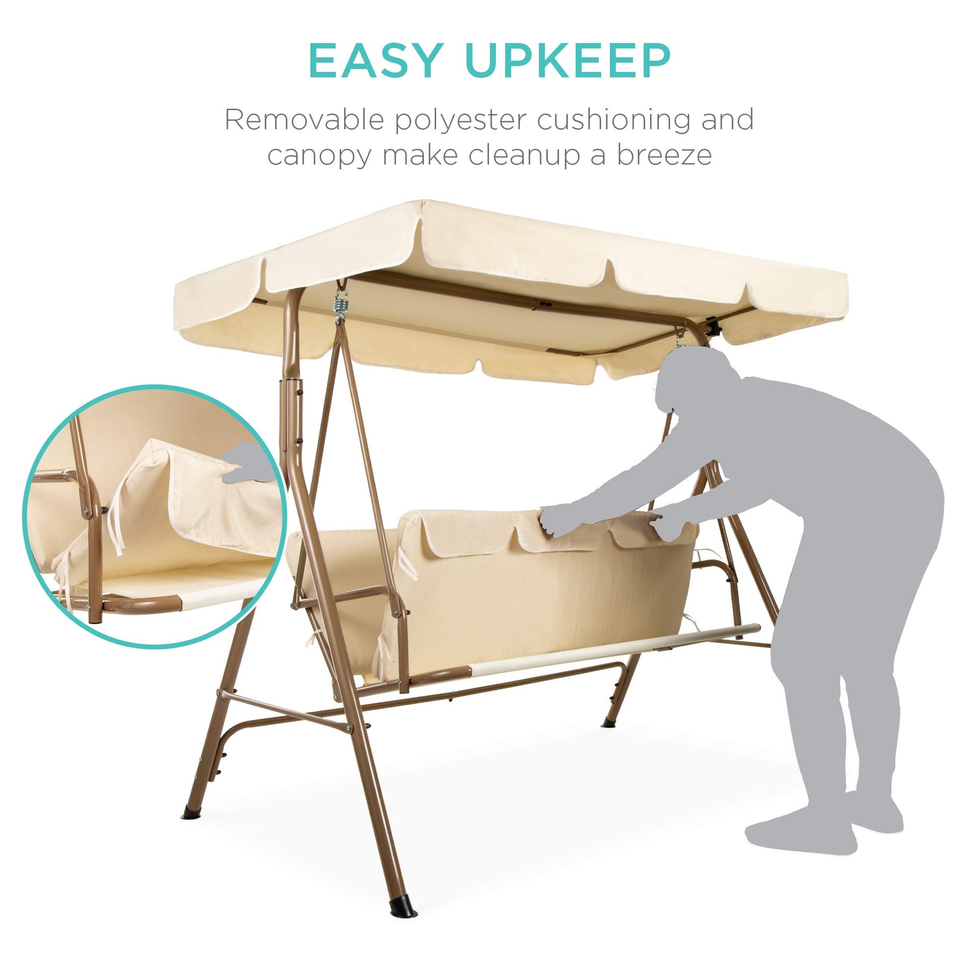 Details: Escape reality in the comfort of your own backyard with this 2-person convertible swing. Its UV-resistant canopy adjusts to multiple angles, allowing the sun’s harmful rays to be blocked from any direction. The swing’s all-weather cushions are also removable for easy cleaning, helping to keep it looking its best. There’s no better solution for ultimate relaxation! Specifications: Overall Dimensions: 67.5”(L) x 41”(W) x 60.5”(H) Canopy Dimensions: 67”(L) x 44”(W) x 6”(H) Seat Dimensions: 51”(L) x 17.5”(W) Seat Backrest Dimensions: 50”(L) x 19”(W) Floor-to-Seat Dimensions: 19” Weight Capacity: 485 lbs. Weight: 39 lbs. Color: Beige Material: Steel, Polyester Assembly required (with instructions)