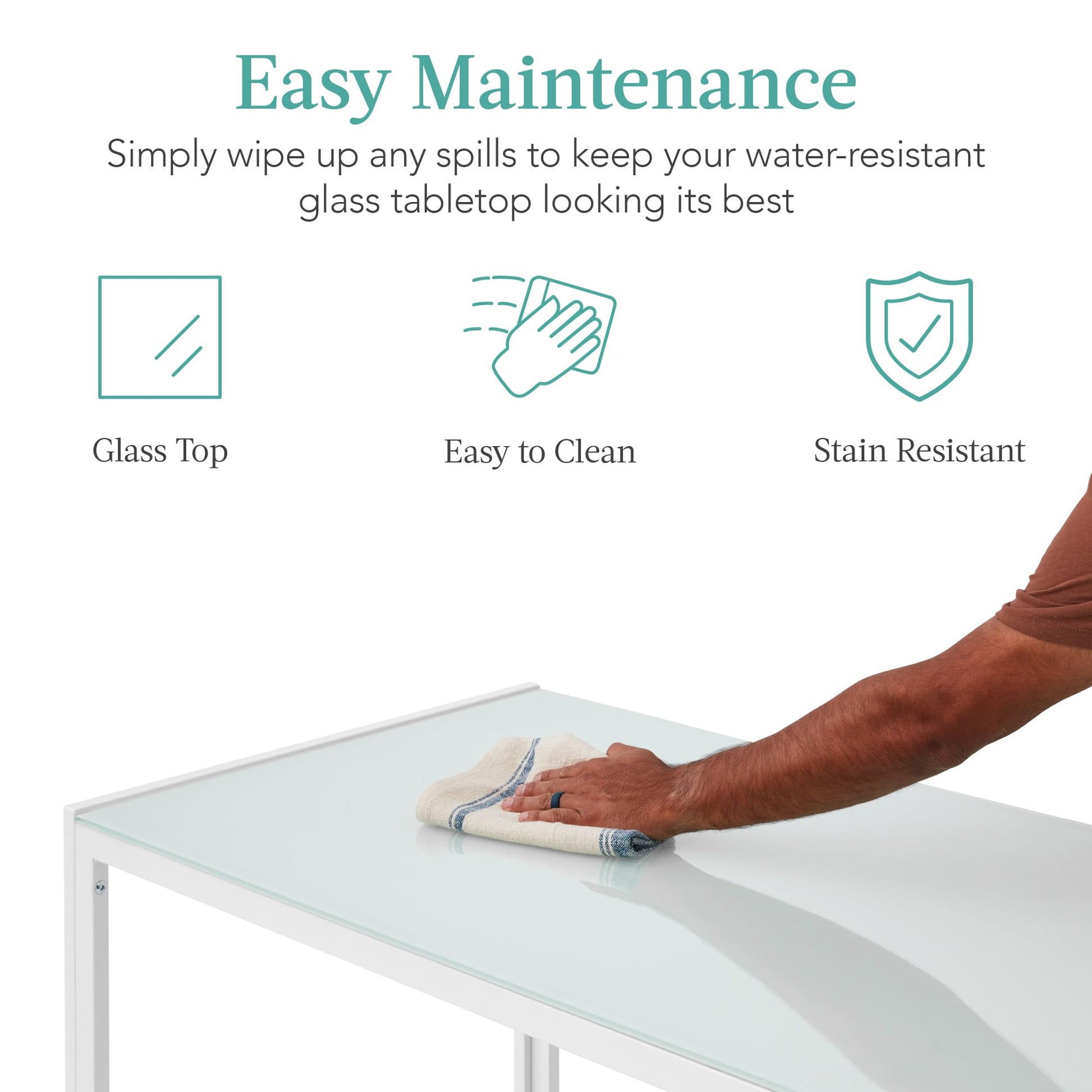 - EASY MAINTENANCE: In case of spills, the water-resistant glass tabletop allows for the easiest cleanup possible; simply wipe away the mess and be done in seconds!