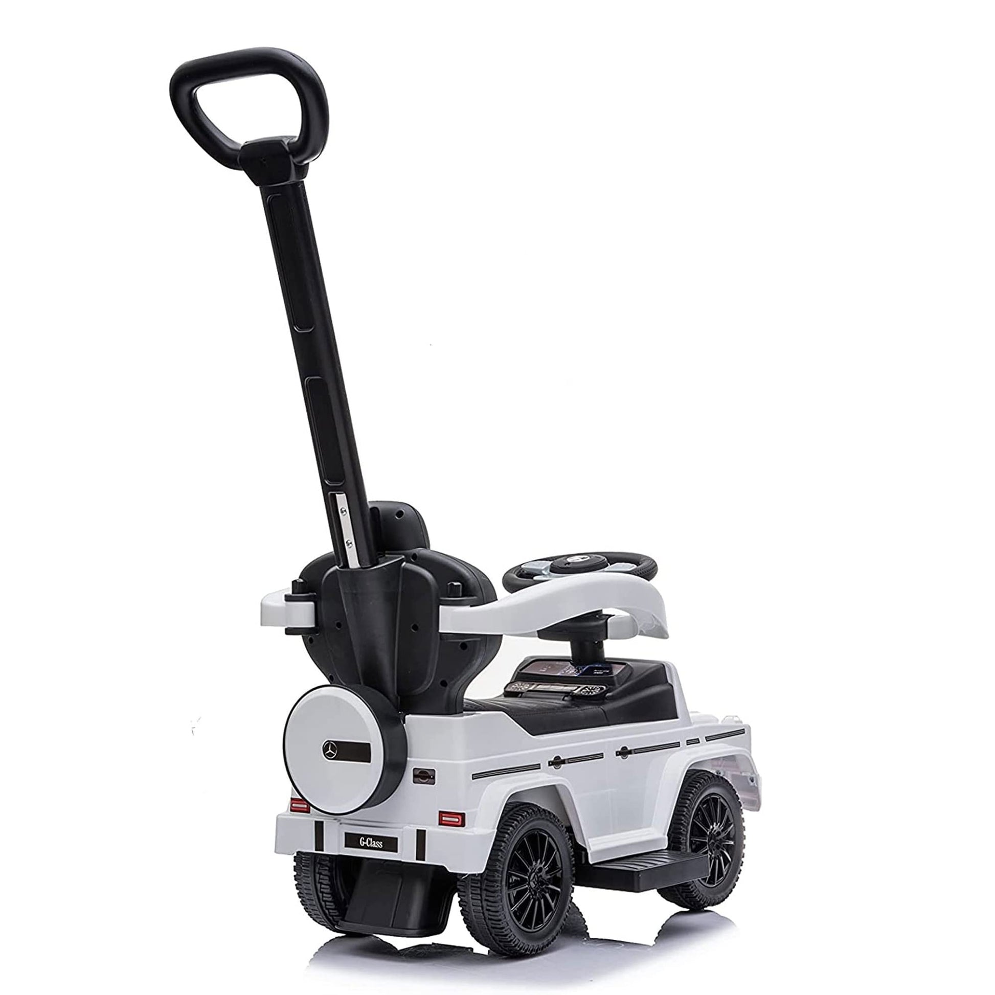 Details: Officially Licensed Mercedes G-Wagon 3 In 1 Push Car Is Suitable For Kids From 12 Months To 3 Years Old. It Is A Stroller, Walking Car, And A Riding Car. This Push Car Has A Removable Stroller Handle, Foot Rest, And Hand Rails And Has Music And Horn Sounds.