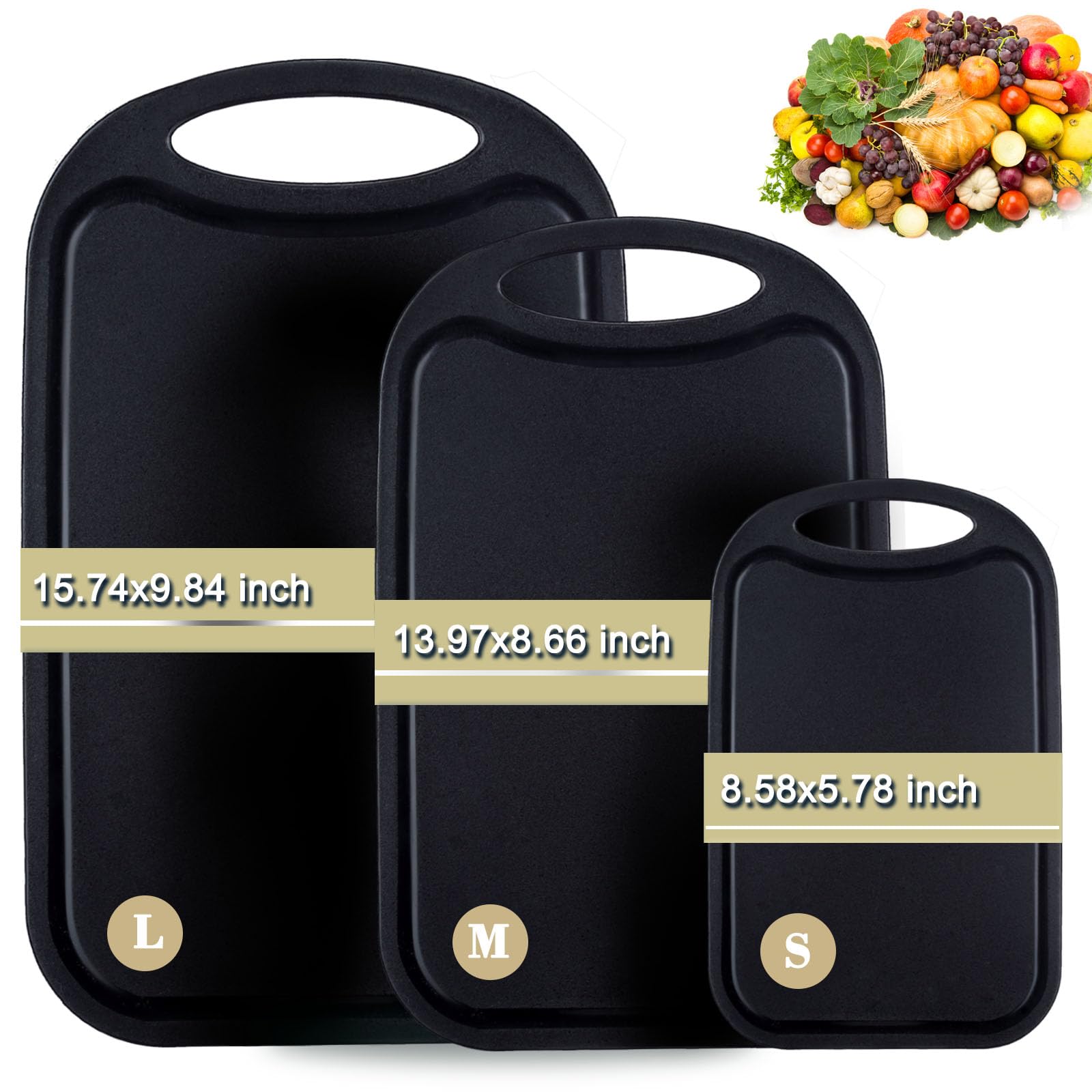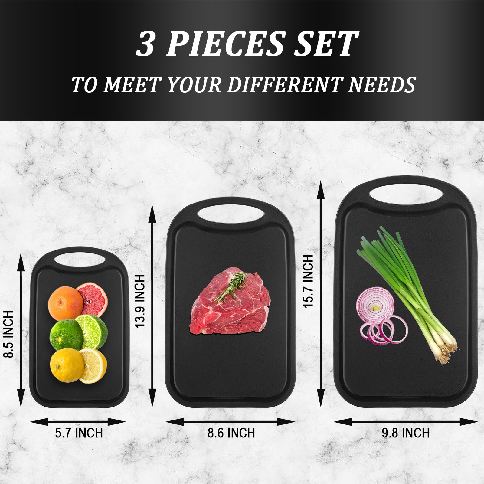Bestdin Cutting Boards for Kitchen, Black Cutting Board Set for 3, BPA Free Chopping Board, Plastic Cutting Board with Easy Grip Handle, Non-porous Meat Cutting Board, Dishwasher Safe.