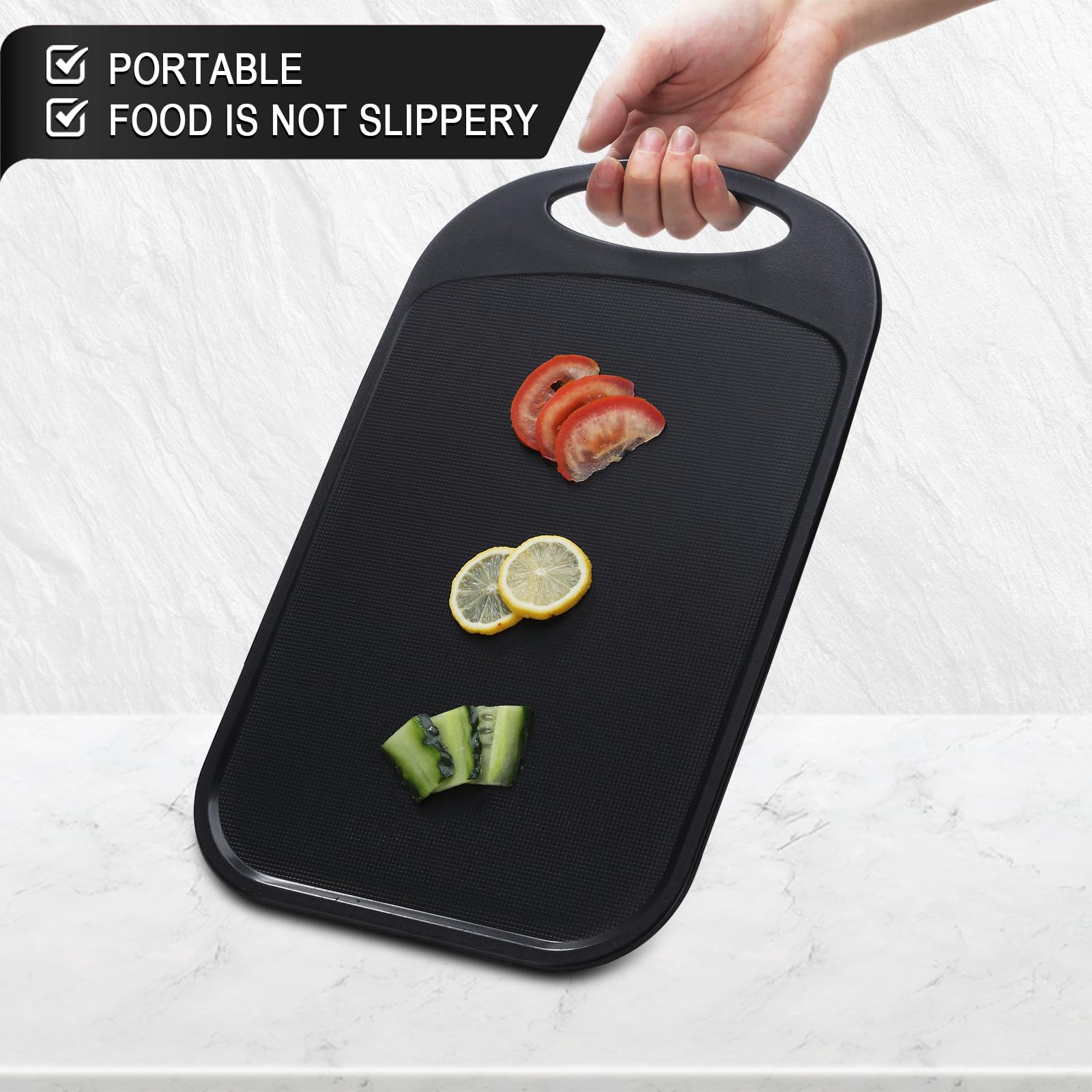 - ✔【High-Quality Materials】The cutting boards for the kitchen are carefully crafted from a non-porous plastic that's very thick and dense. They're highly resistant to heat, food stains, and slices/cuts that will not hurt the board or the knife when chopped. Perfect for everyday use and a reliable gift for new dorm residents and housewarming parties.