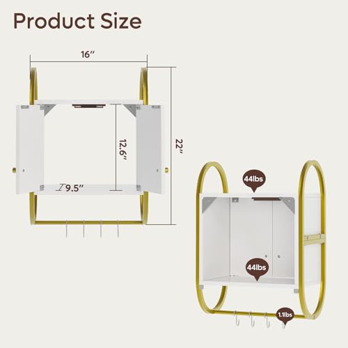 - Efficient Wall Storage: Utilize wall space effectively with this small floating wall shelves, adding extra storage while keeping your floor area neat. Featuring 3 tiers, it boasts an open shelf on top for displaying decor or storing toiletries, while the enclosed middle cabinet offers ample storage for everyday essentials. Below, a towel rack with 4 hooks keeps towels, bathrobes, and cups within reach. Stay organized with this compact and stylish solution