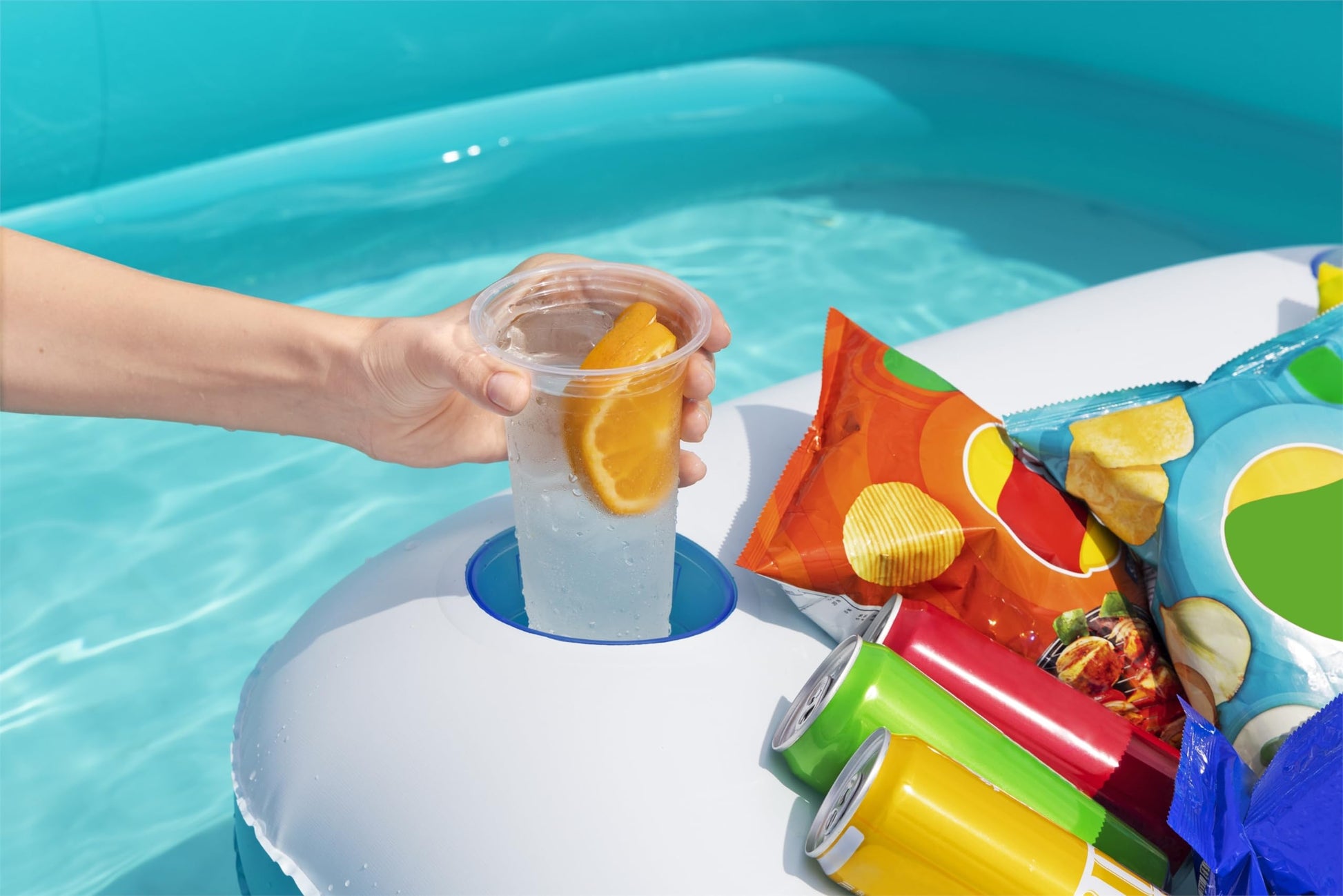 - REMOVABLE CENTER CONSOLE: This swimming pool features an inflatable center console with 4 cup holders for refreshing drinks, tasty snacks and other summer essentials. You can even use it as a flat surface to play games on while you chill in the water.