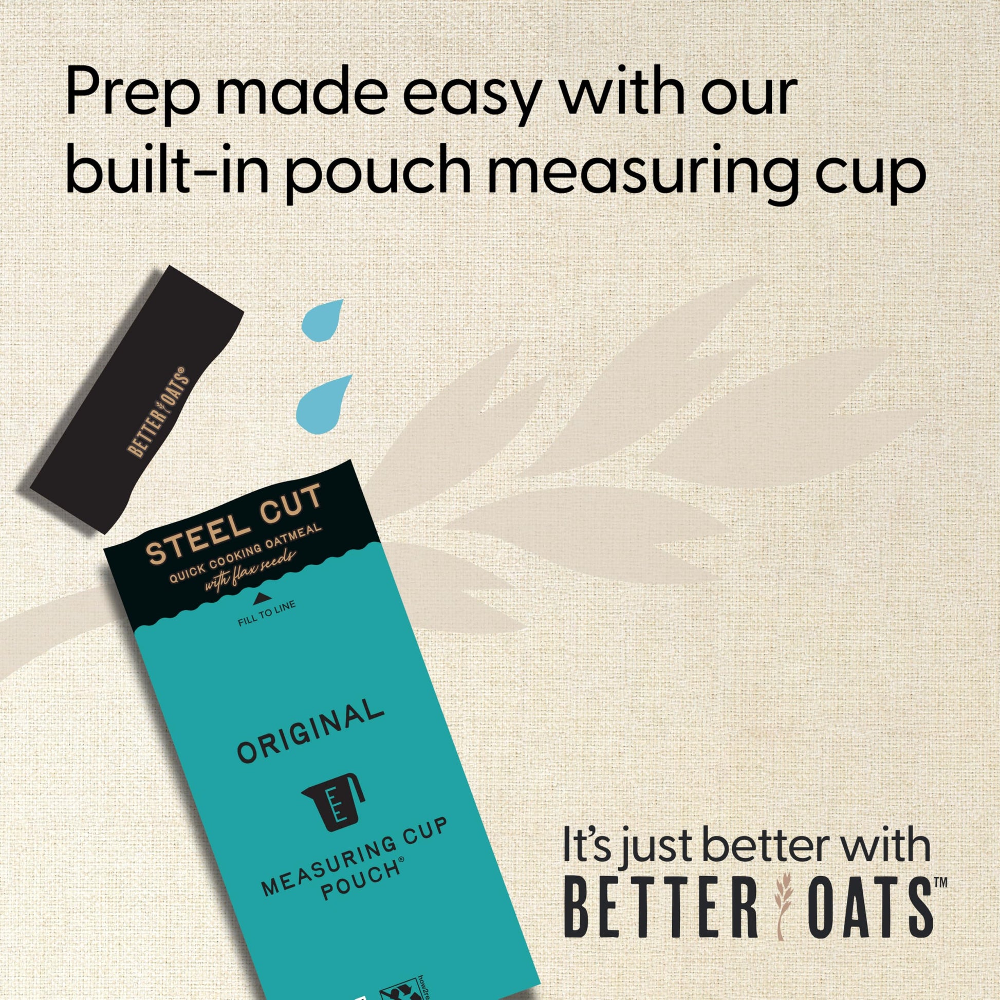 Details: Feel good about what you feed your family in the mornings with Better Oats Steel Cut Apples and Cinnamon Oatmeal with Flax Seeds. These 10 cinnamon apple oatmeal pouches contain a blend of steel cut oats, flax seeds, and real dried apple pieces that deliver a delicious hot oatmeal taste. The steel cut oats in this instant oatmeal are cut with hardened steel to create a thick, hearty texture in your morning breakfast oatmeal. These apple cinnamon flavored steel cut oats contain 22 grams of whole grain per serving (1) and are a good source of fiber that help with your digestive system and can help you feel full longer. These Better Oats oatmeal packets conveniently cook in 2.5 minutes. Choose Better Oats oatmeal for a quick oatmeal option that's wholesome and delicious. (1) Nutritionists recommend eating 3 or more servings of whole grain foods per day (about 16g whole grain per serving or at least 48g per day).