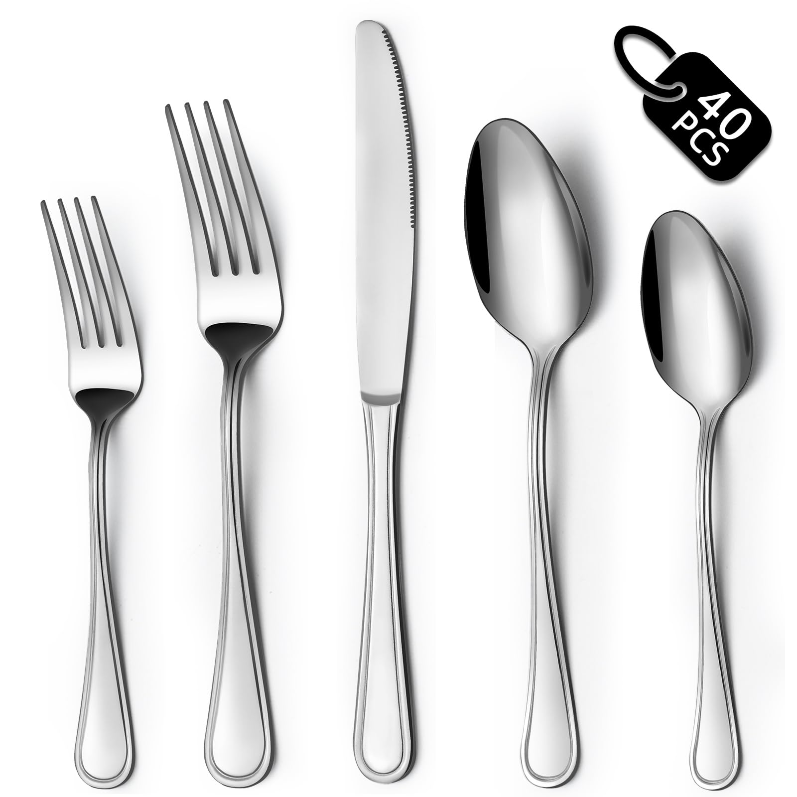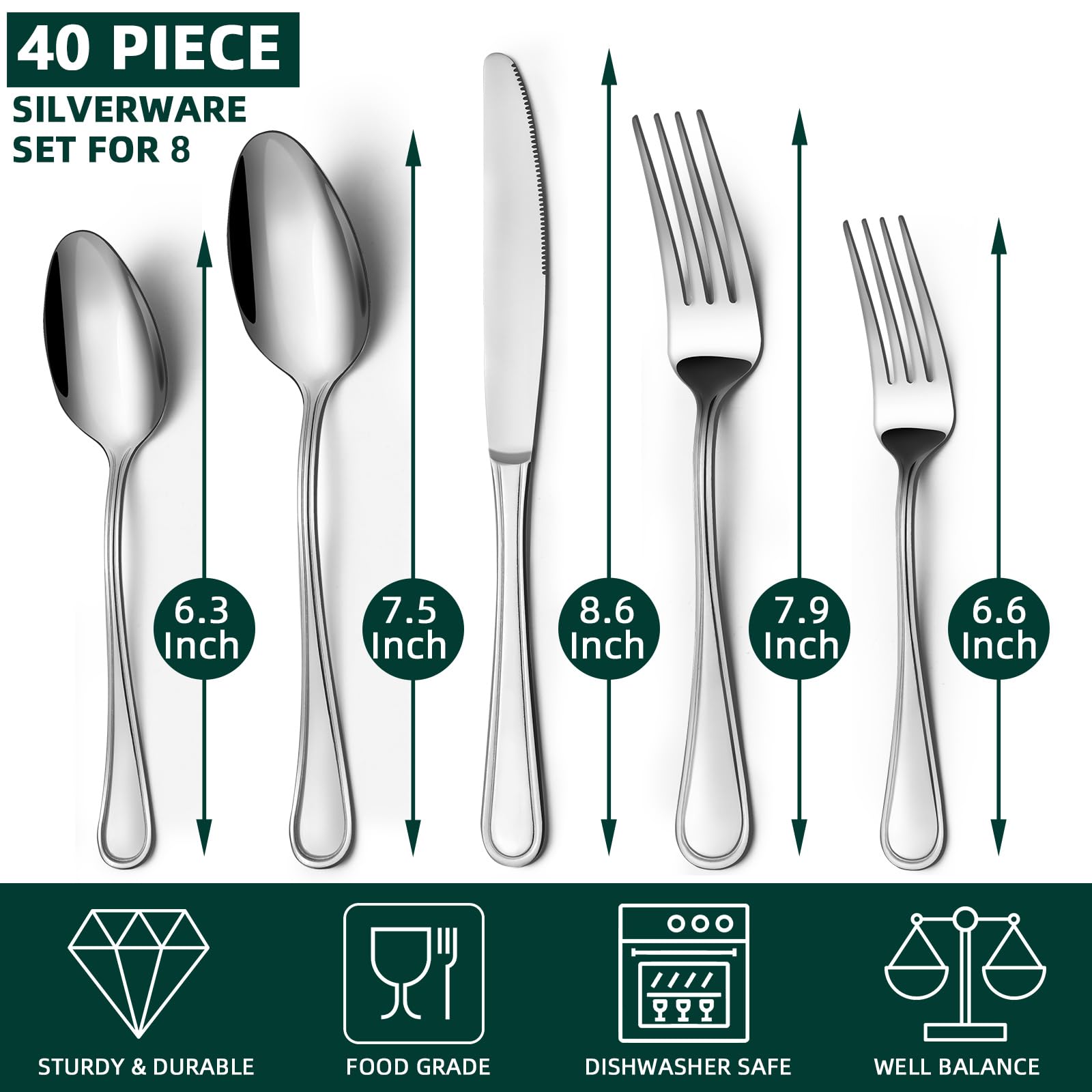 - 【Great Value & Service For 8】This 40 pieces silverware set Includes 8 dinner forks, 8 dinner spoons, 8 dinner knives, 8 teaspoons, 8 salad forks. This silverware set is so good value for money that can perfectly replace the flatware lost in your daily life. In addition, our cutlery set is essential for both daily use and for preparing dinner or parties