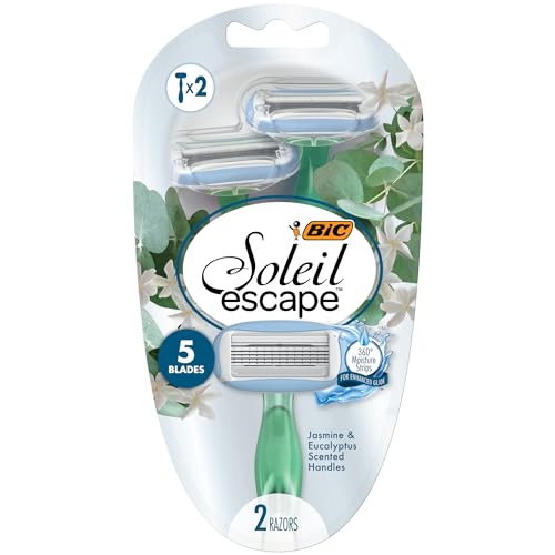- One 2-count pack of BIC Soleil Escape 5-Blade Disposable Razors for women with mood-boosting, refreshingly clean Jasmine & Eucalyptus Scented Handles