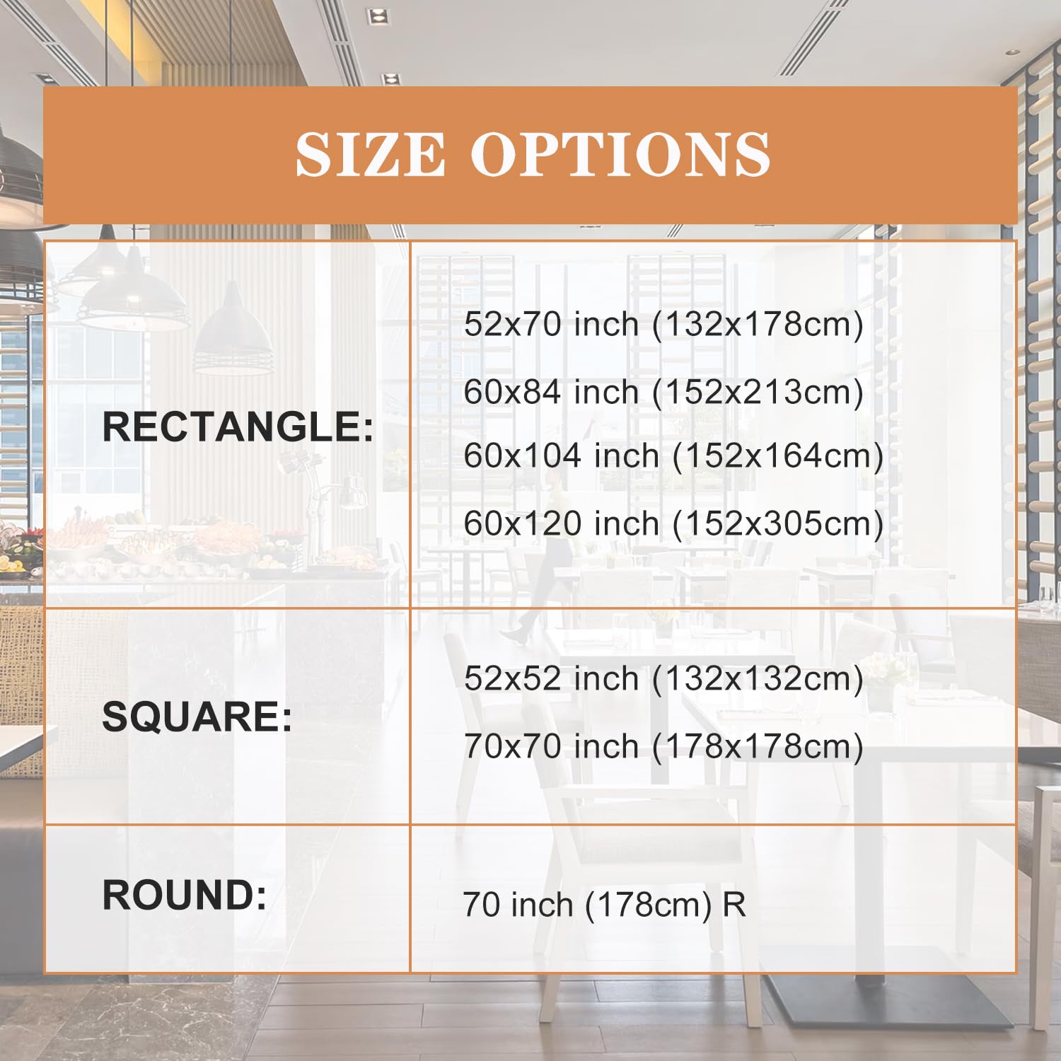 - Multiple Sizes Choose: These textured table cover are in three shape: Rectangular, Square, Round; Available in 52x52”, 52x70”, 60x84”, 60x104”, 60x120”, 70x70”, 70” Round. Please measure your table size before buying.
