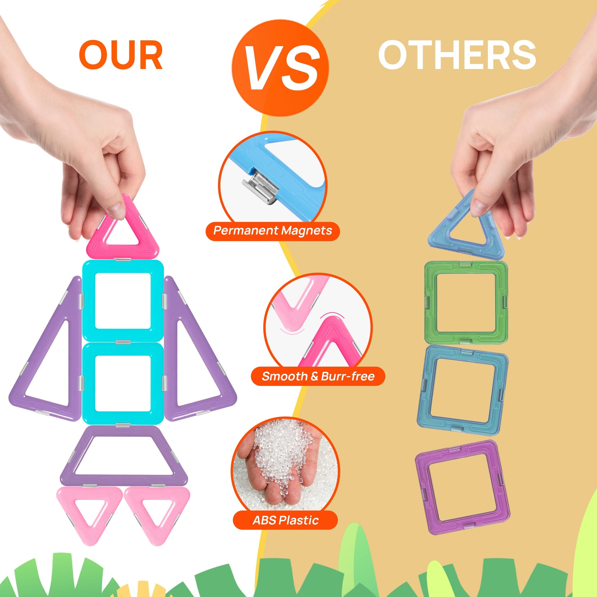 - An approved STEM toy, Magnetic Tiles boost fine motor skills, color recognition, and shape understanding. It empowers kids to create limitless 2D and 3D designs, fostering their imaginative potential without boundaries.