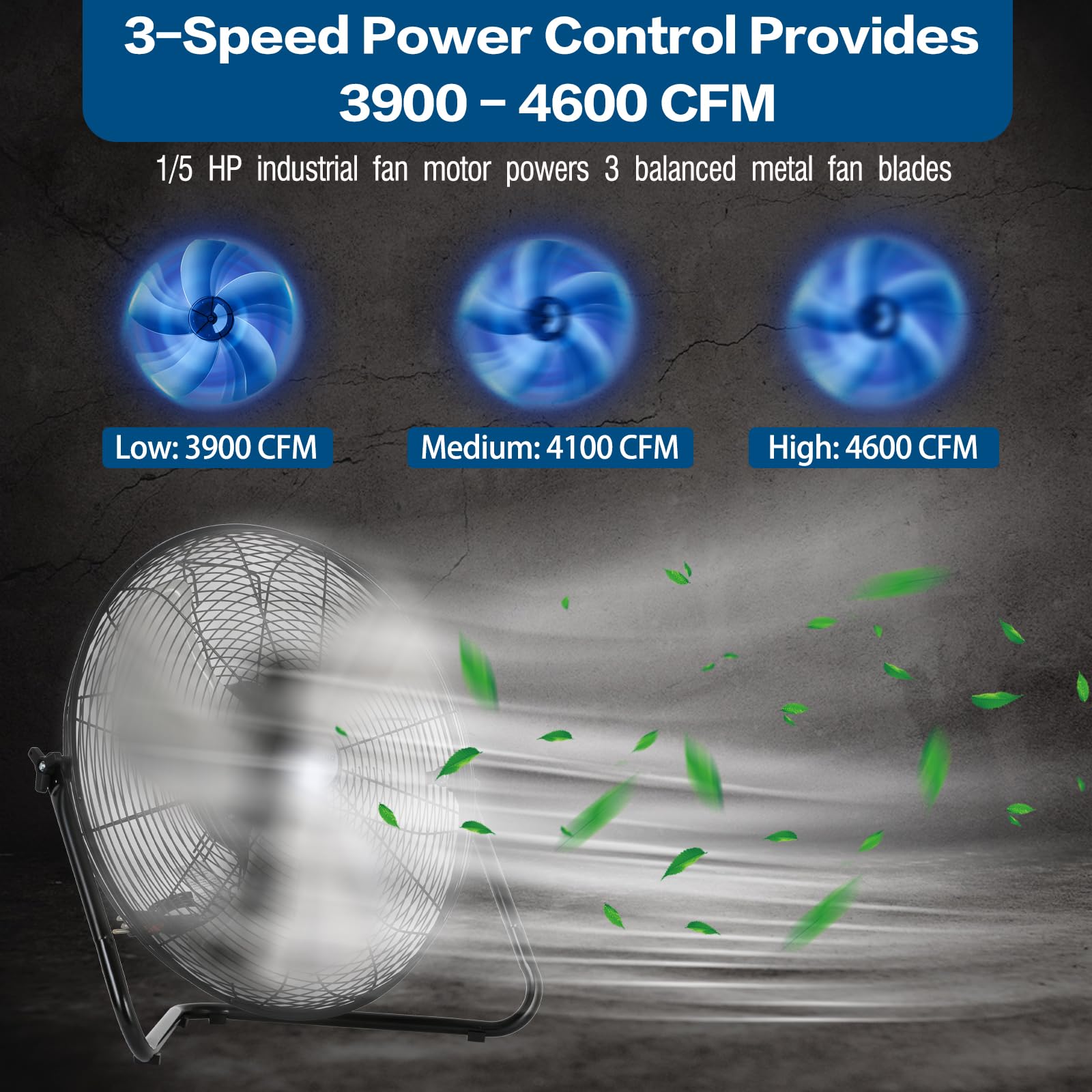 - 【3-Speed Control】The 20 inch high velocity floor fan comes with three speeds(4600 CFM/4100 CFM/3900 CFM), so you can customize the power to your liking. The industrial fan’s grill housing has a built-in handle, so it’s easy to move throughout your workspace or garage. This heavy duty metal floor fan offers you a reliable performance that will cool you down on a hot summer day.