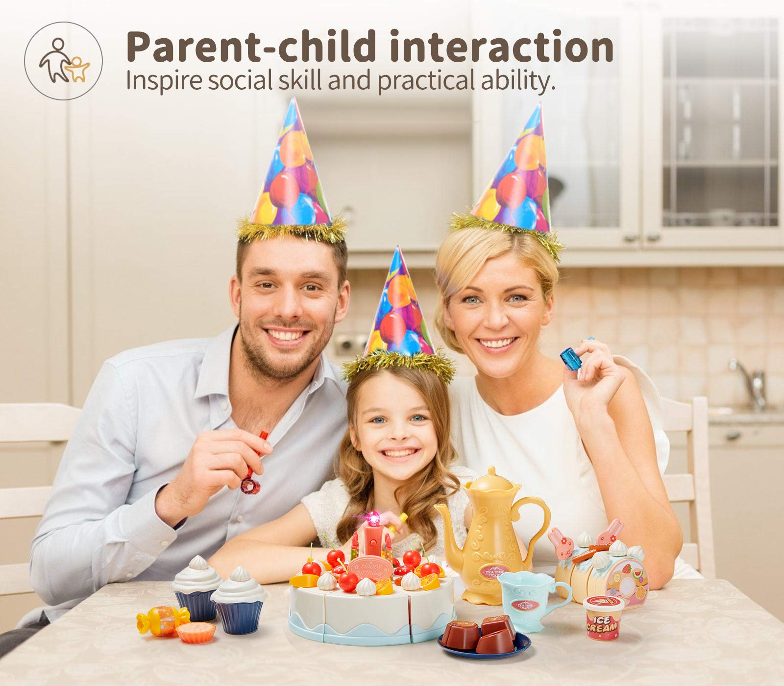 Birthday Cake Toys Set, Geyiie Cake Play Tea Party Dessert Set with Light, 88 PCS Pretend Play Cutting Food with Chocolate,Fruit Decor,Candles and More,Gift Choice for Toddlers Boys Girls