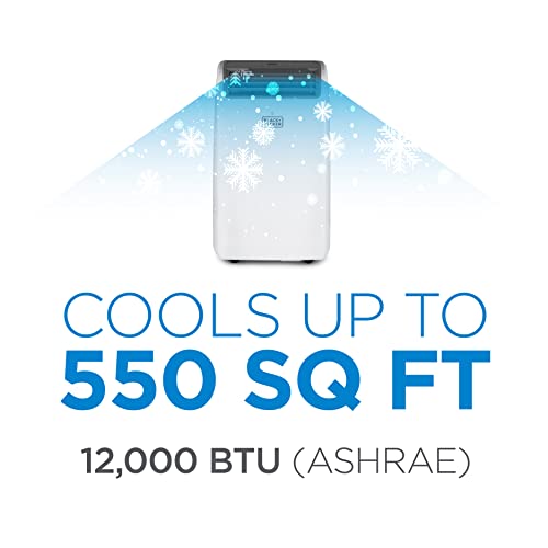 Details: Description This BLACK+DECKER 7000 BTU DOE (12000 BTU ASHRAE 128) portable air conditioner) is your best friend during the summer months, supplying cool, free-flowing, and comfortable air 24/7 in rooms up to 550 square feet. When it comes to ac units for rooms, our portable cooler (16.5” x 14.06” x 27.09) has 3 functionalities all in one: fan, dehumidifier, and cool. Included with your new portable ac air conditioner (56.8 lbs.) is a fully functional remote control so you can set your temperature rooms up to 22 feet away—although will not function between walls and other obstacles. With a 24-hour timer that can be set on or off, a slide-out washable filter, and auto water evaporation, the benefits of this room air conditioner speak for themselves. Enjoy the sleep mode function, where the decided air conditioning temperature will increase by 1°F/1°C the first 60 minutes— then another 1°F/1°C for the following 60 minutes—and eventually remain at the selected temperature for 6 hours before shutting off automatically. When it comes to portable air conditioners, this one can't be beat. Included is a top mounted control panel with LED display and an easy-to-install window kit so you can place your indoor air conditioner and room cooler air conditioner anywhere. With four casters on the bottom and two side handles, easily slide your air conditioner no window into any room of the house. Our portable ac unit comes with a power cord and plug storage for optimal convenience and uses R32 refrigerant for no Ozone depletion. Truly, one of the best room air conditioners! The large front vented airflow outlet with 2-way adjustable louvers ensures superior functionality and total room cooler satisfaction. Stay cool during the hot months with BLACK+DECKER!