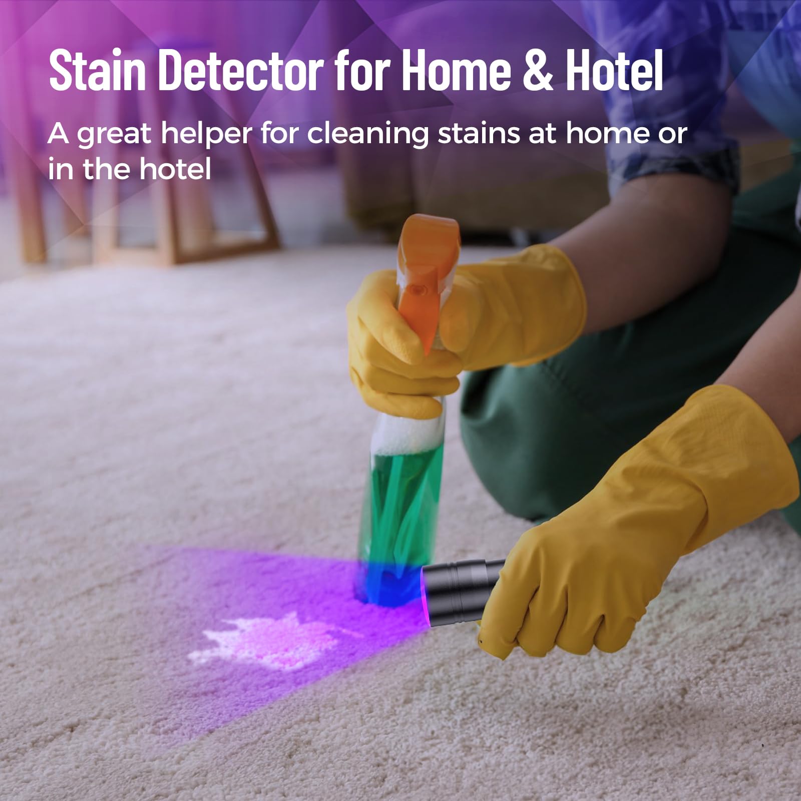 - Efficient Pet Urine & Stain Detector Black Light: Equipped with a 12 LED chip, this 395nm blacklight flashlight reveals stains and pet urine on carpets with ease (Effective only for dry urine detection). These small UV lights are an indispensable and versatile tool for both home and outdoor use, perfect for cleaning up pet accidents.