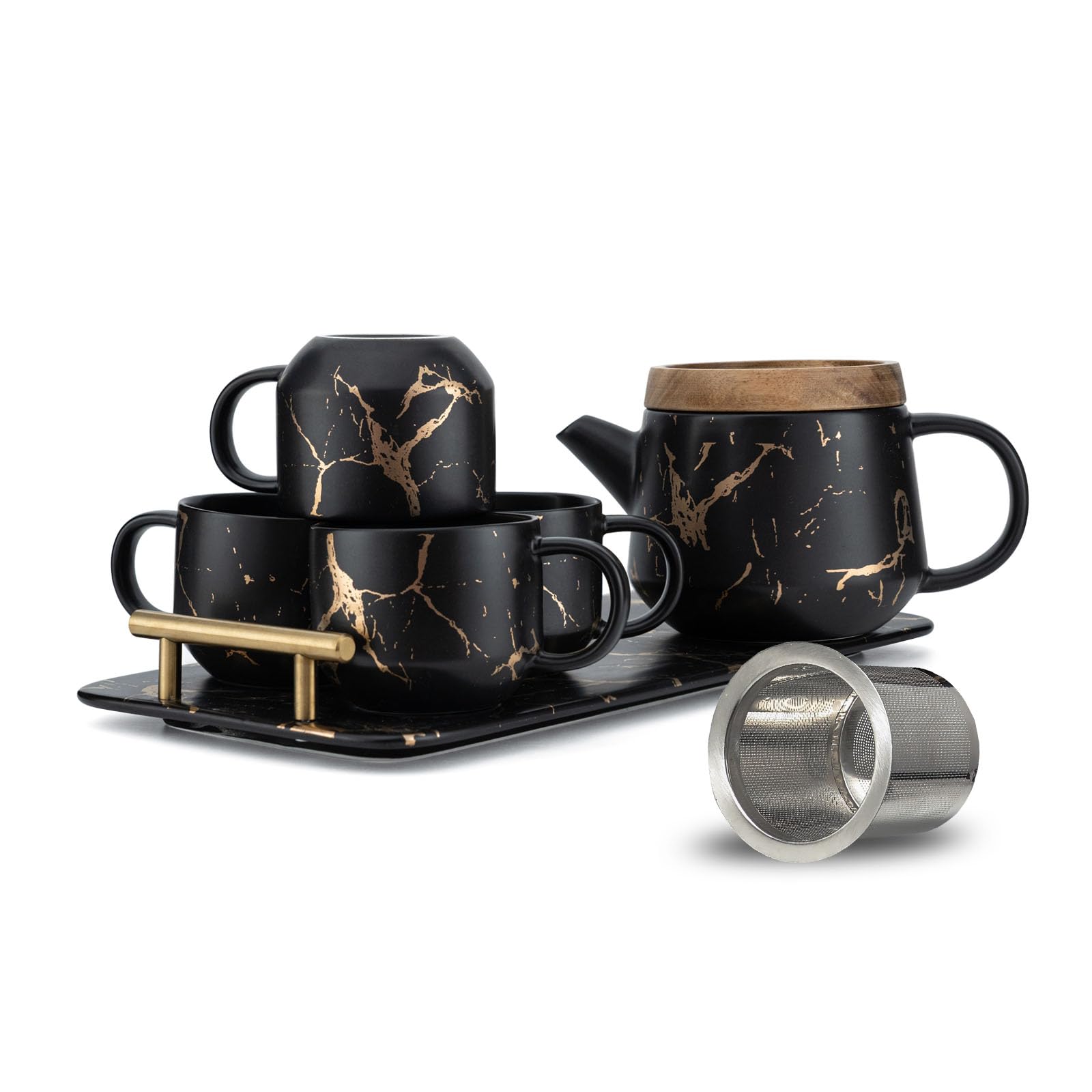 Black Tea Set, 25oz Tea Pot Sets with Infuser, 4 Tea Cups and Porcelain Tray, Luxury Tea Sets for Women with Modern Marble Design, Tea Gift Set for Tea Lovers, Woman and Men